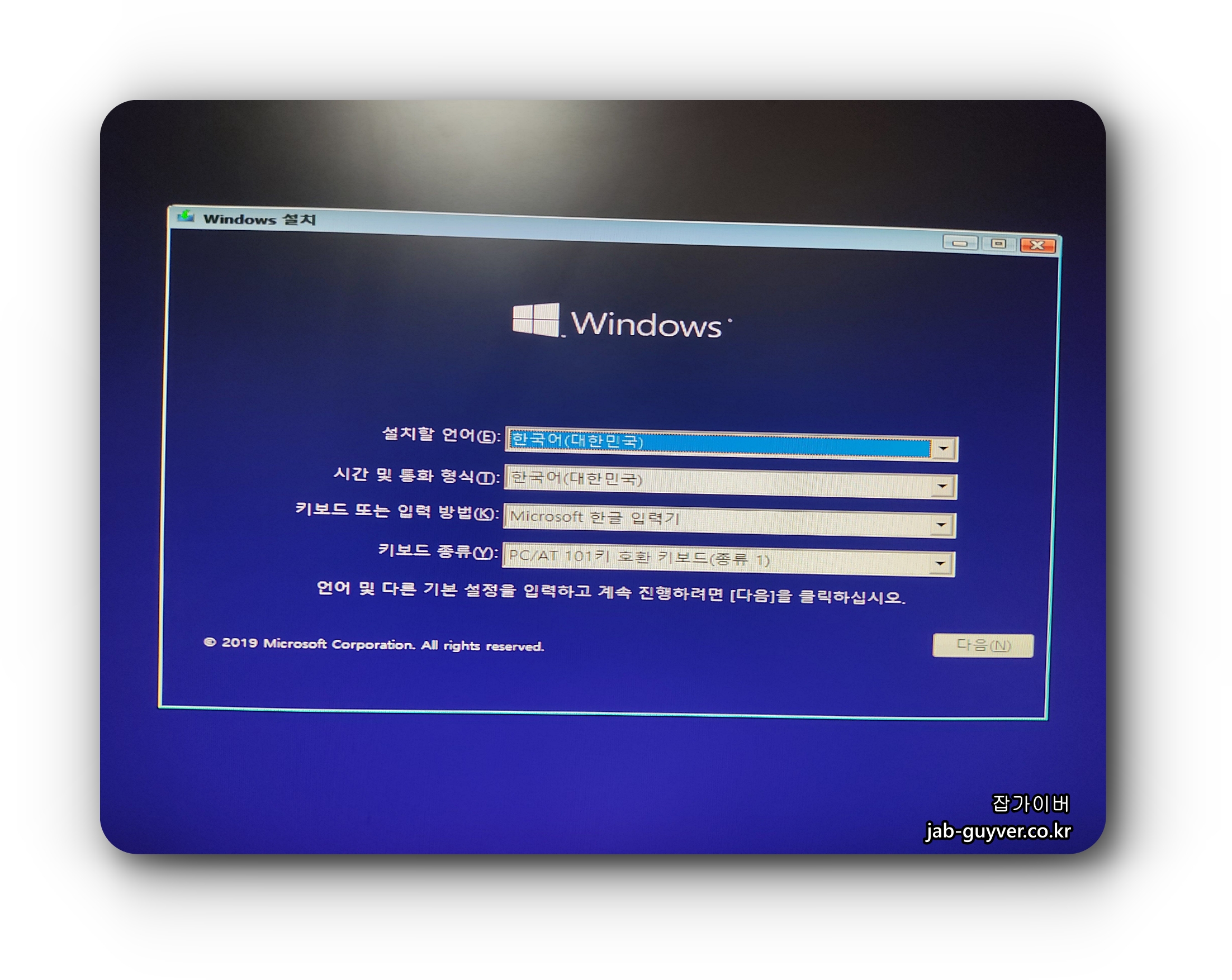 윈도우 설치화면이 나오면 설치언어 및 시간대 , 키보드 등을 확인하고 다음으로 넘어갑니다.