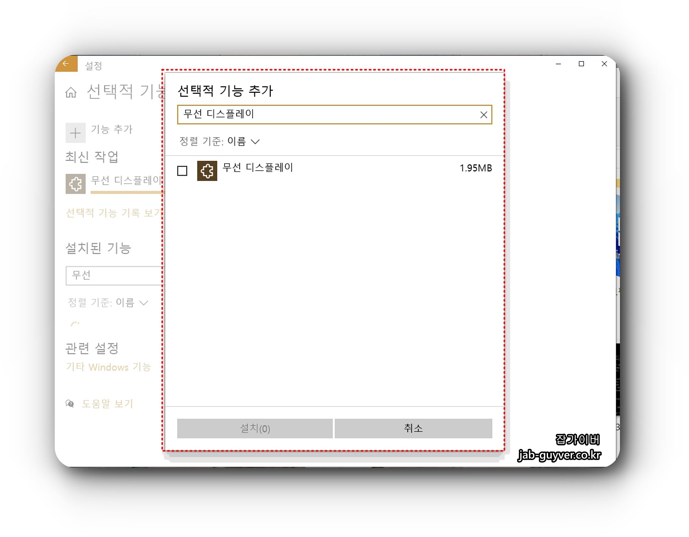 여기서 현재 설치된 기능 목록에 무선 디스플레이가 있는지 먼저 확인하고, 없다면 기능 추가에서 검색해 설치합니다.