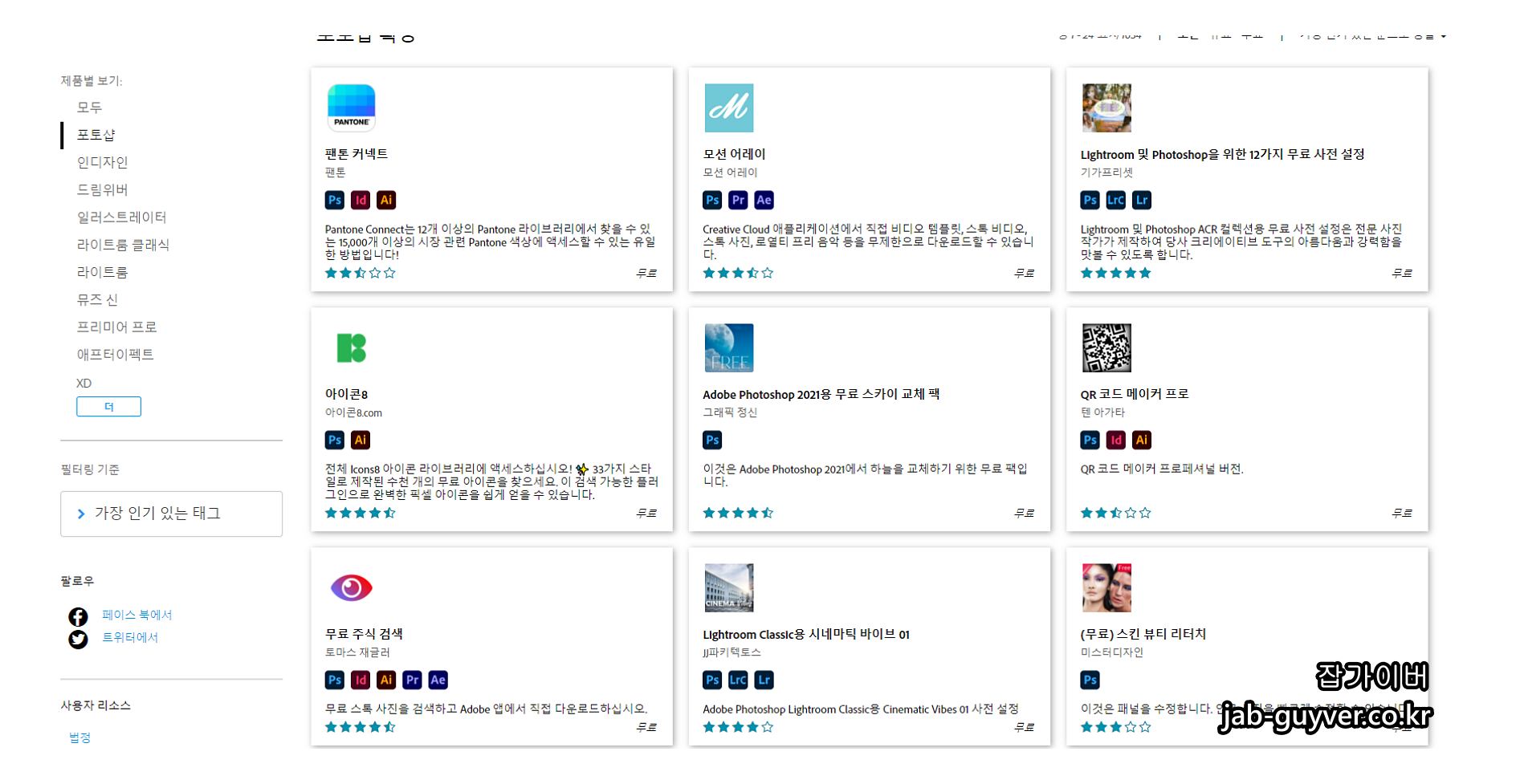 무료로 제공하는 포토샵, 인디자인, 드림위버, 일러스트레이터, 라이트룸 클래식, 뮤즈씩, 프리미어 프로,에프터이펙트 XD 등 다양한 Adobe 플러그인과 필터등을 다양한 기능을 사용할 수 있습니다.