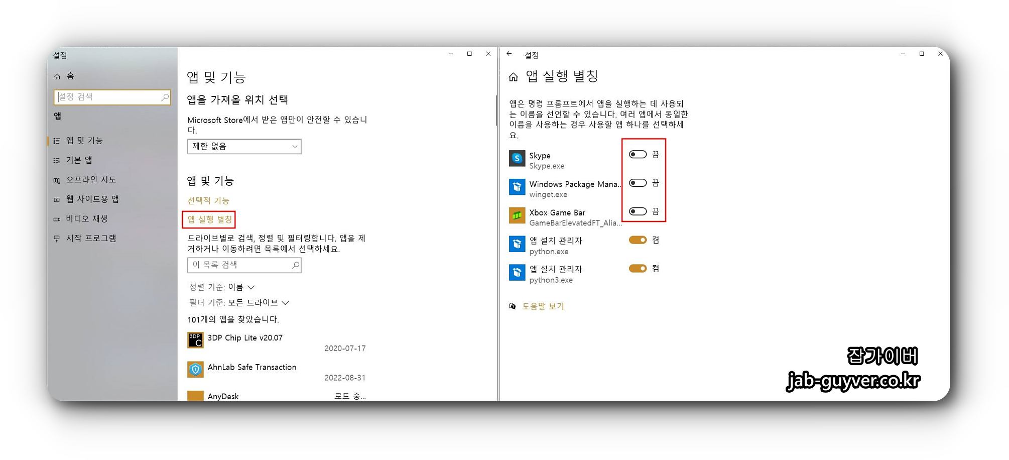 만약 무선 디스플레이 연결이 안된다면 앱 실행 별칭에서 해당기능이 활성화되어 있는지 확인합니다.