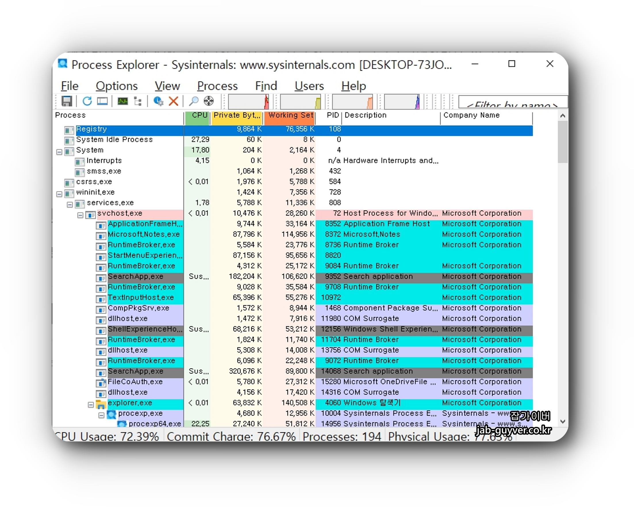 위 파일을 다운로드 후 압축을 해제 후 procexp.exe 파일을 실행합니다.