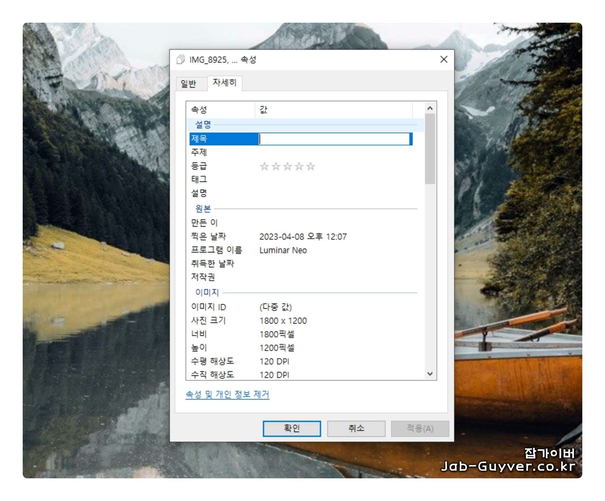 자세히 탭으로 이동하면 해당파일의 제목 및 주제, 등급, 태그, 설명, 원본데이터의 만든이, 찍은 날짜, 프로그램이름, 취득날짜 , 저작권, 이미지 크기 및 너비, 높이 해상도 등을 확인할 수 있습니다.