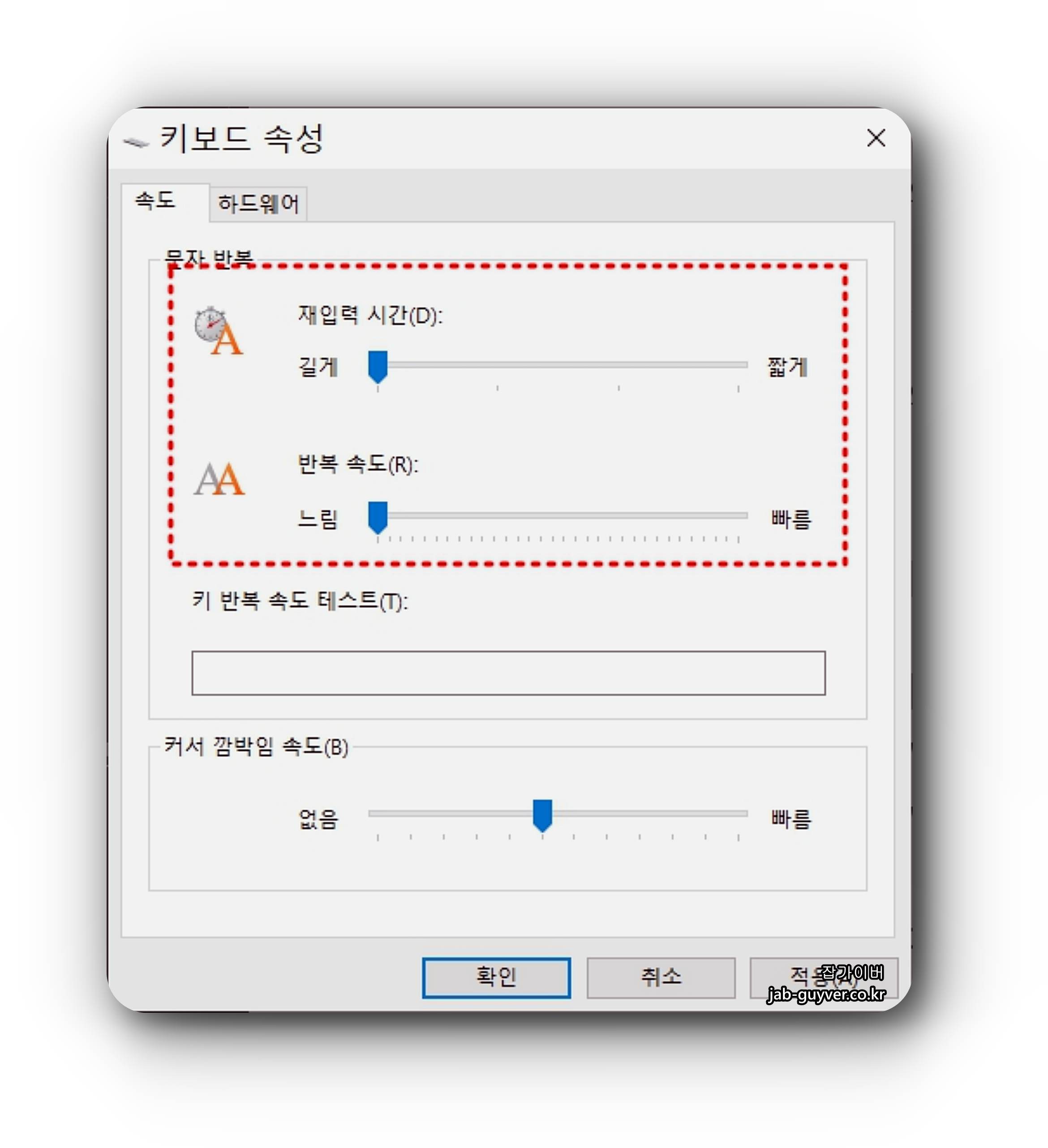 이후 키 반복 속도 테스트에 직접 입력해보면서 키입력이 두번씩 되는지 확인합니다.