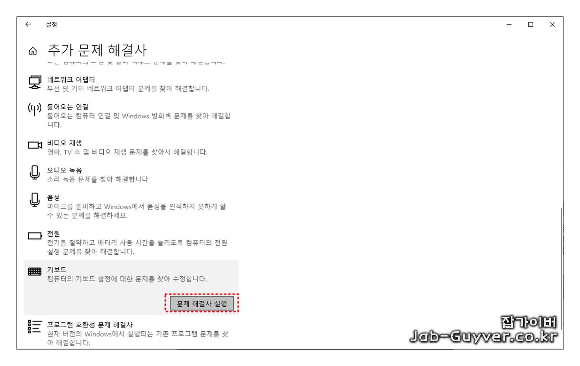 좌측 탭에서 "문제 해결" 항목을 선택하고, 우측 탭에서 "추가 문제 해결사"를 선택한 다음 항목 중에서 "키보드"를 찾아 선택하고, "문제 해결사 실행" 항목을 선택합니다.