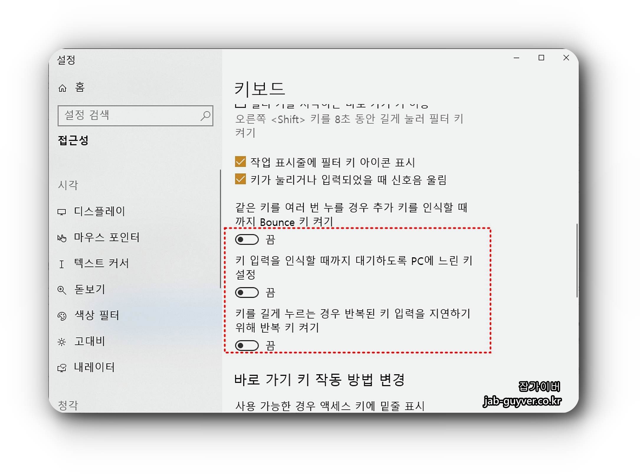 키보드 필터키를 사용하면 짧거나 반복되는 키 입력 시 무시하고 키보드 반복입력되는 속도를 키거나 끌 수 있습니다.