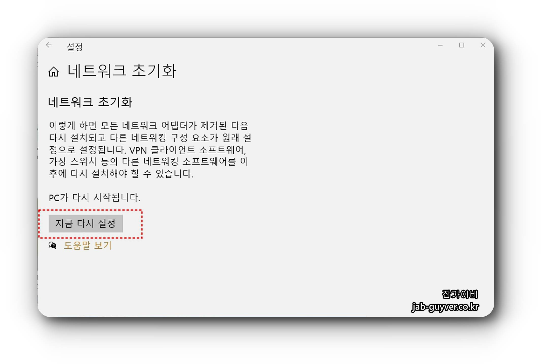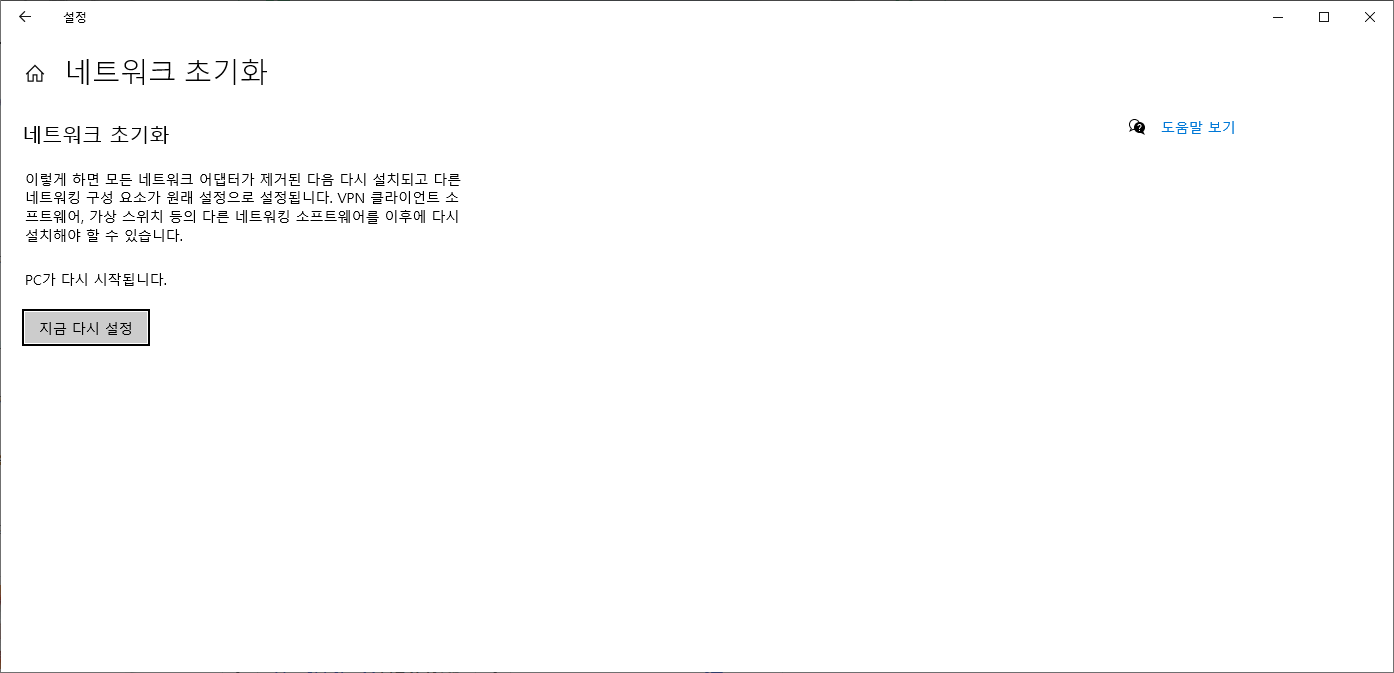 네트워크 초기화 탭을 클릭 후 지금 다시 설정 버튼을 클릭합니다.