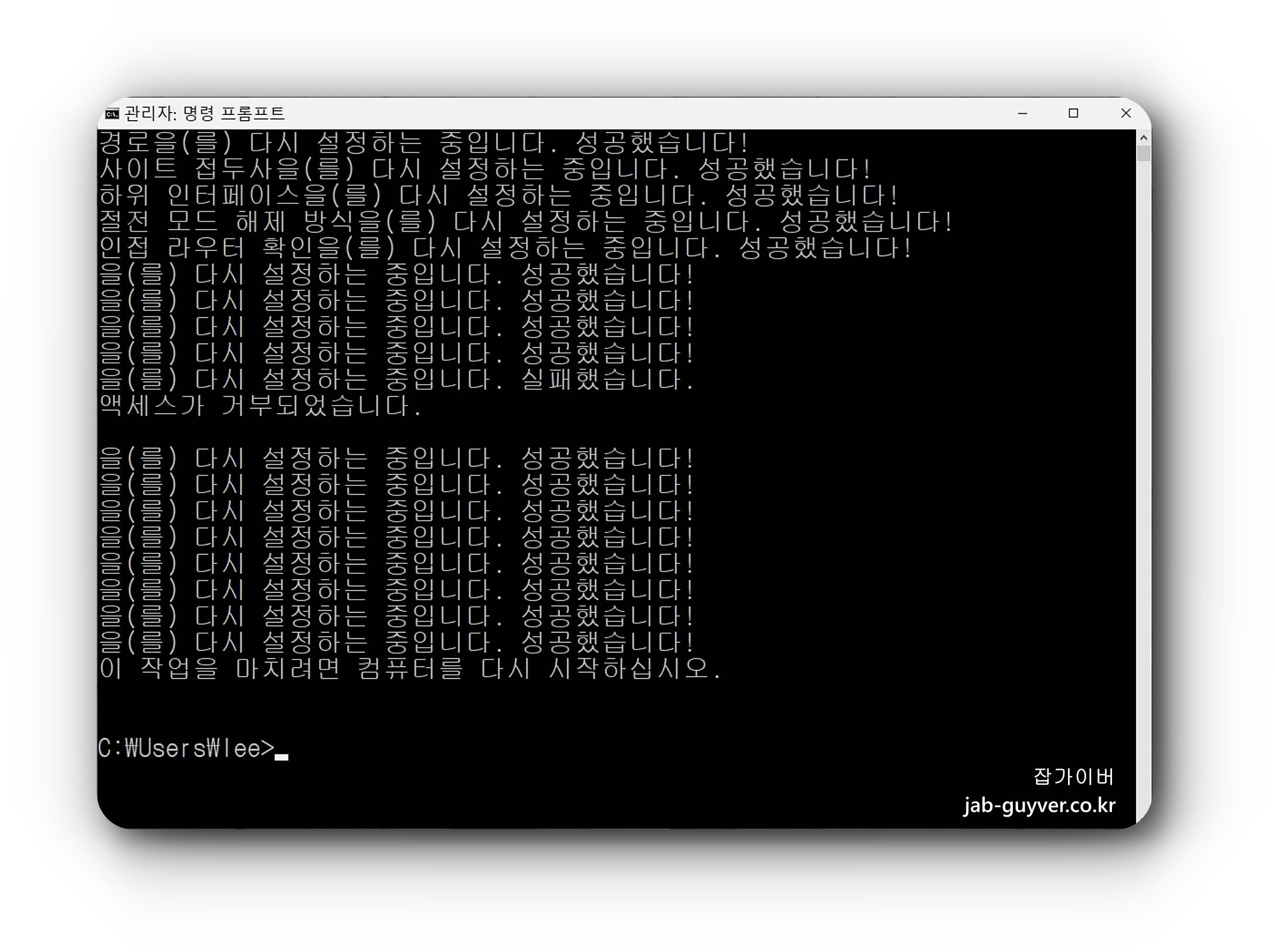 위 명령어를 각각 입력 후 엔터키를 눌러 준 뒤 컴퓨터를 재부팅합니다.