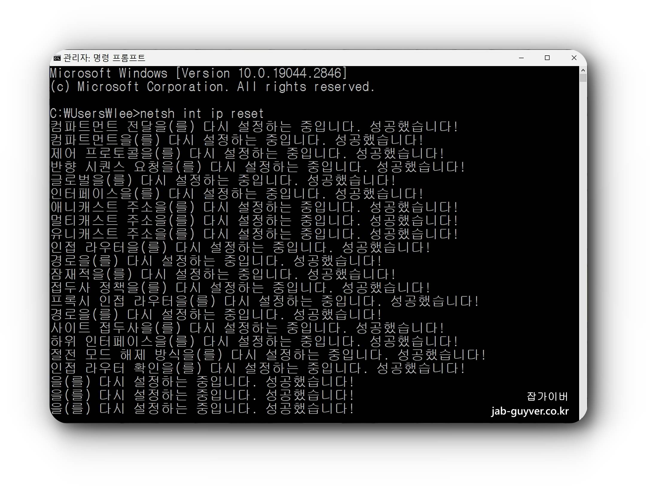이후 컴퓨터를 재부팅하면 네트워크 설정이 초기화 됩니다.