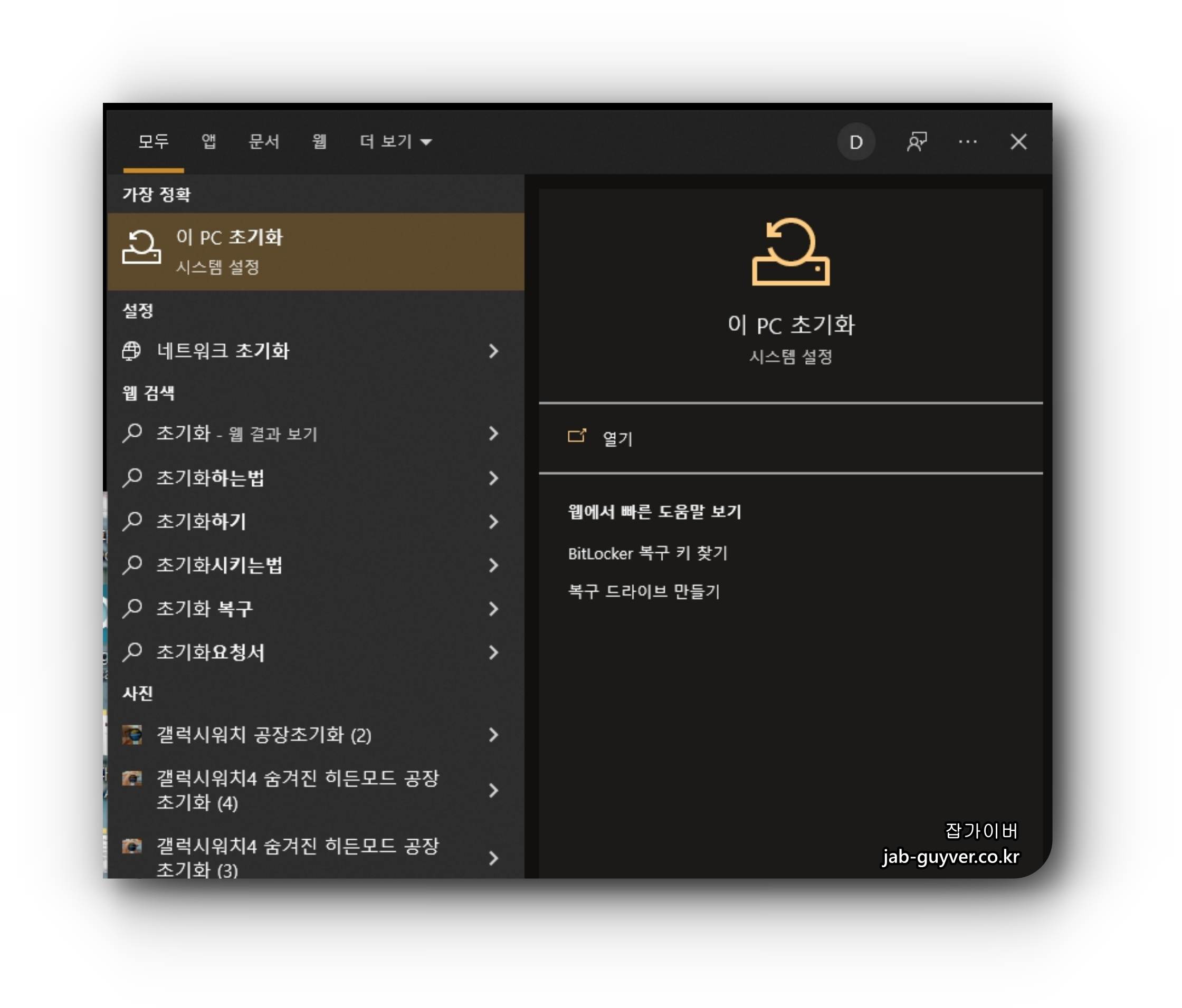 윈도우 초기화 방법은 이 PC 초기화를 통해 현재 설치 된 윈도우를 처음 설치했던 상태로 되돌립니다.