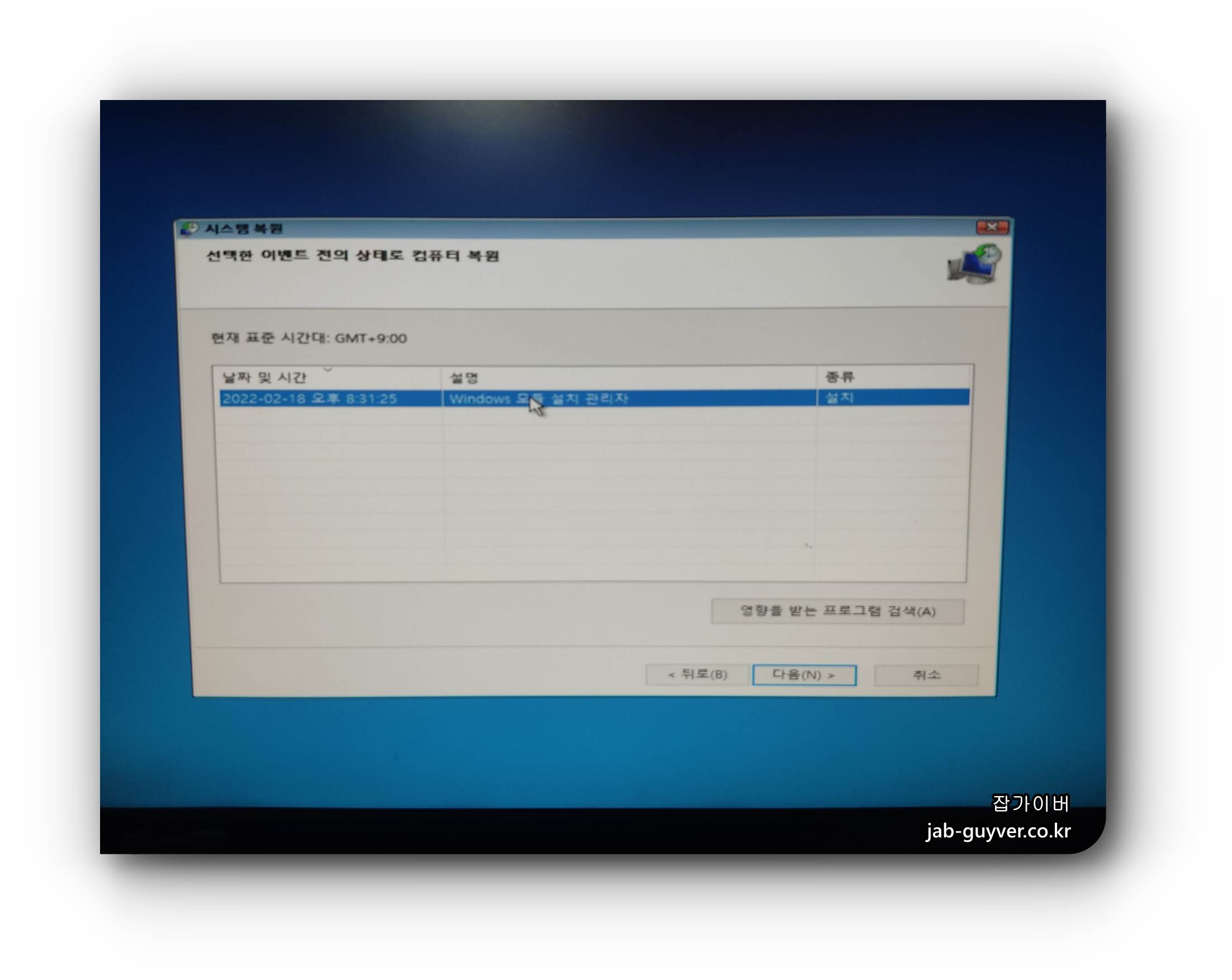만약 윈도우 부팅도 안되는 상태라면 윈도우 복구모드로 부팅 후 복원지점으로 복원합니다.