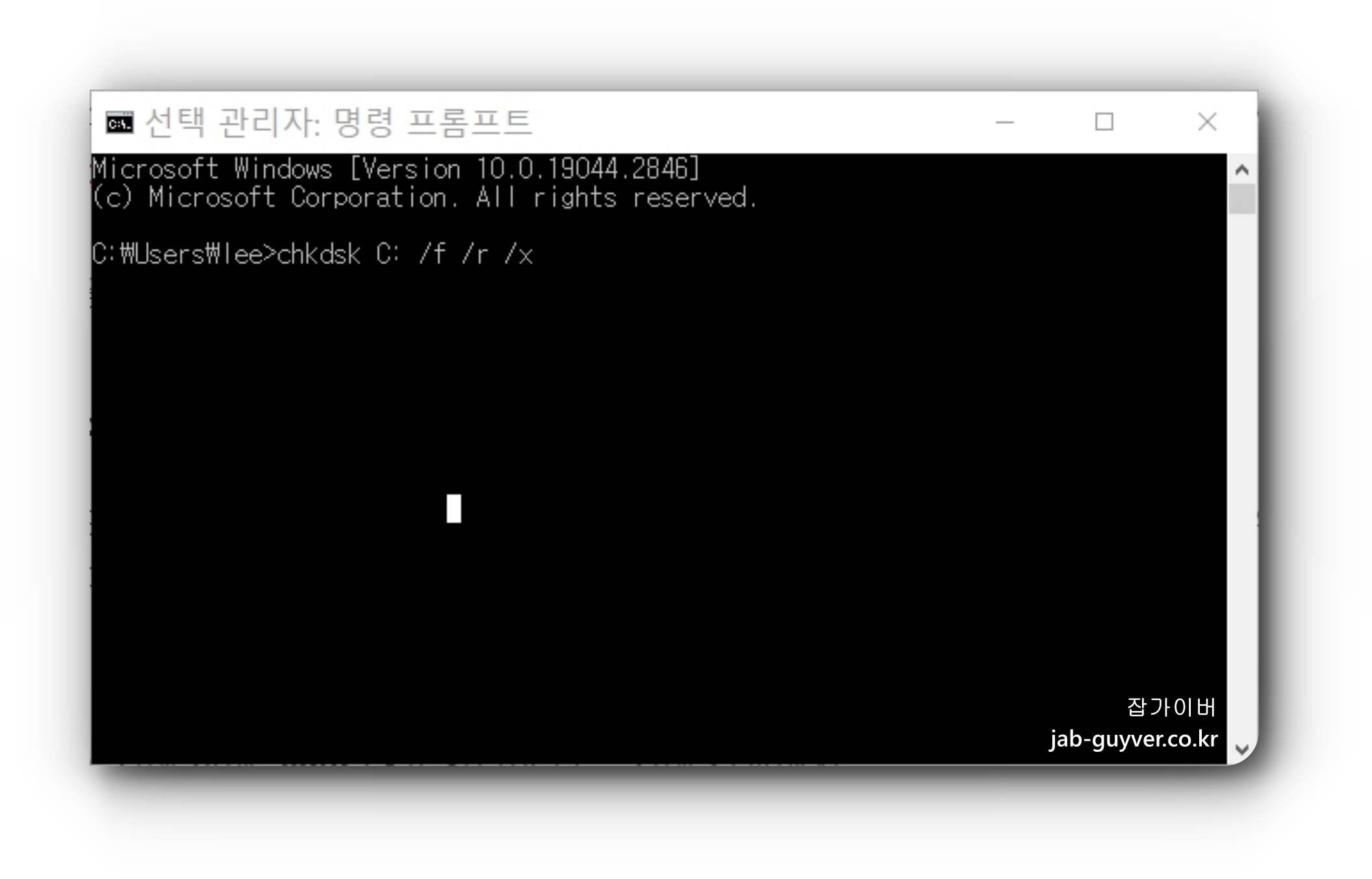 | 위 명령어는 C 드라이브를 대상으로 디스크 검사를 실행하며, 검사 중에 문제가 발견되면 자동으로 복구합니다. |