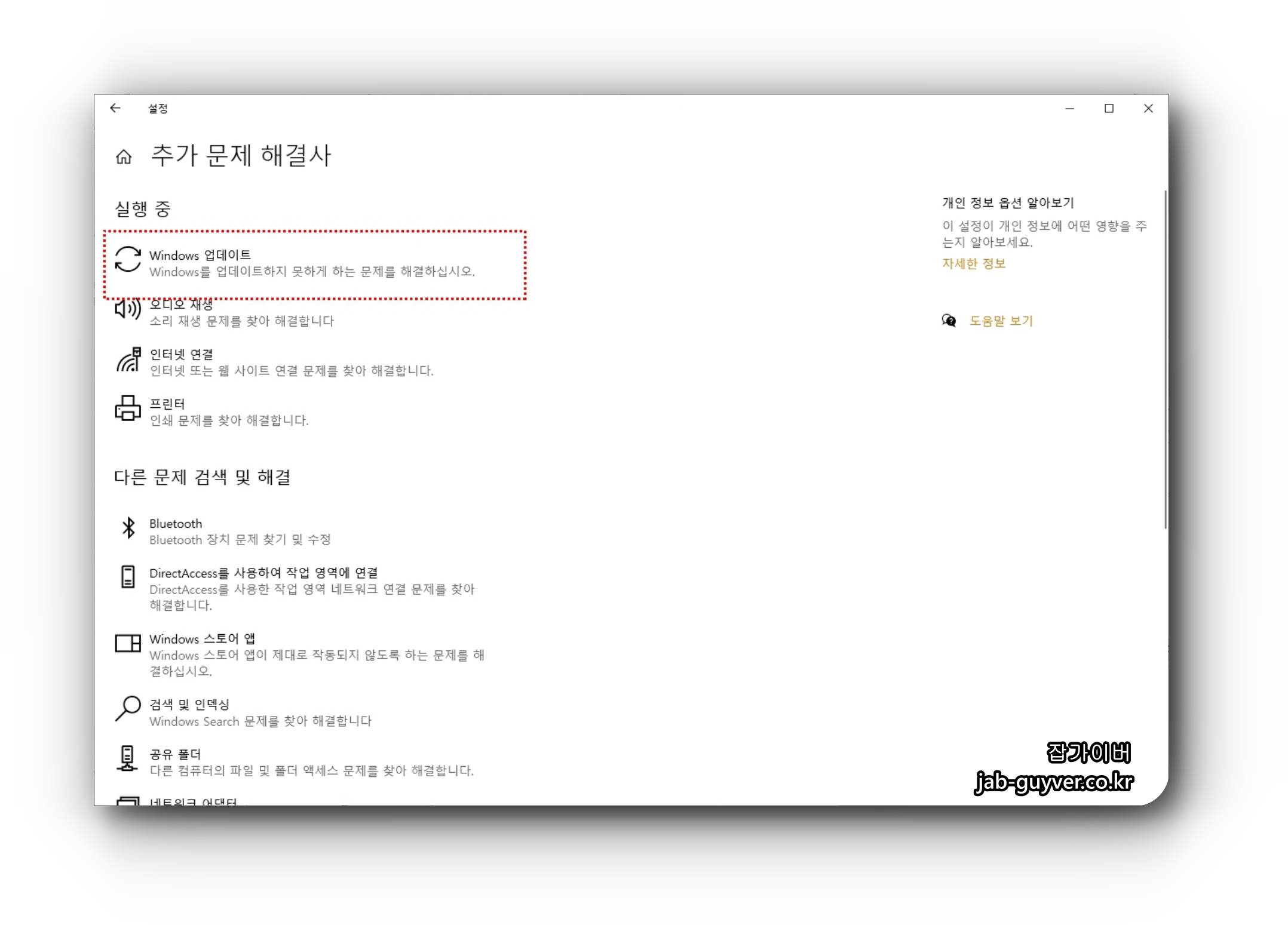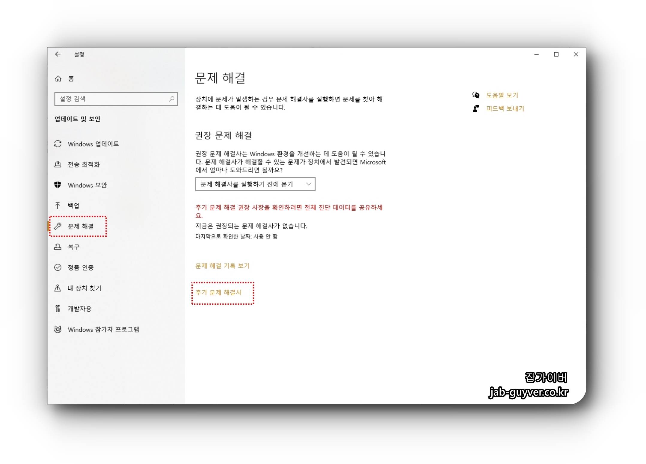 업데이트 및 초기화에 문제가 있다면 문제해결 -> 추가 문제해결사를 선택합니다.
