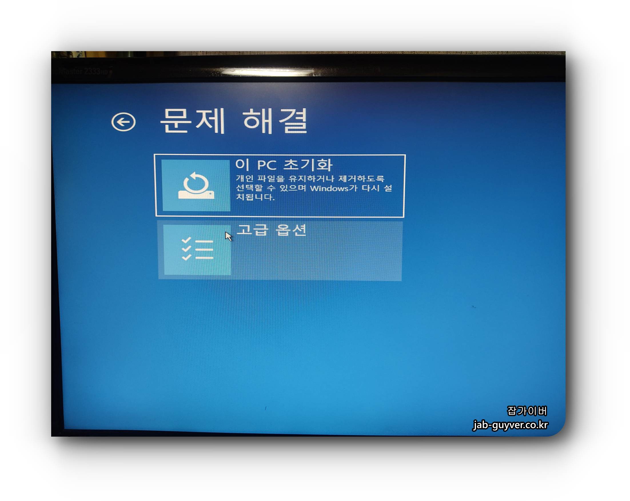 문제해결에서는 별도로 이 PC 초기화를 통해 윈도우 초기화도 가능하기 때문에 초기화 실패 시 복구모드에서 초기화를 진행해봅니다.