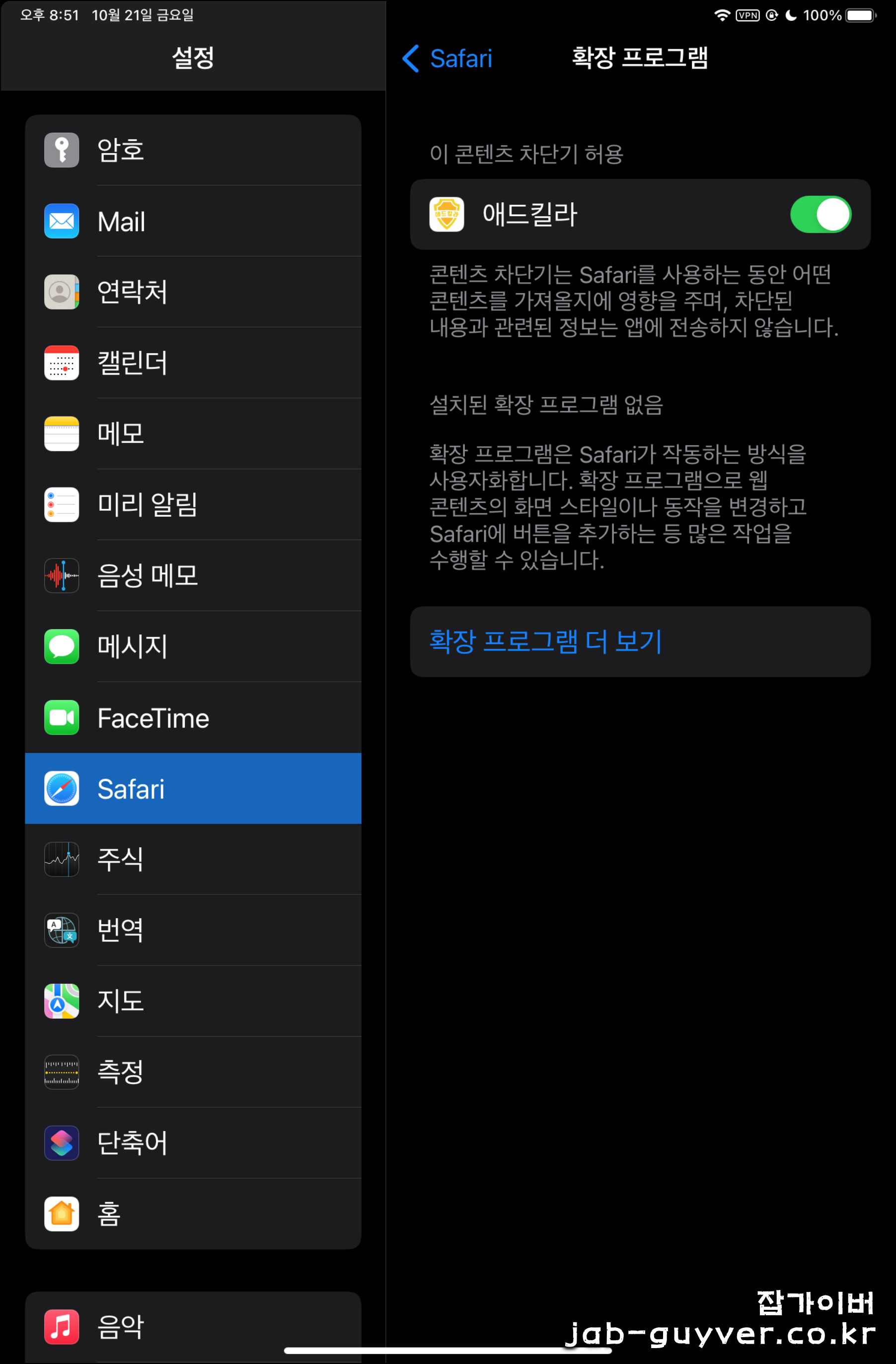 다음 인터넷 연결 시 광고차단 기능이 실행되기 위해서는 아이폰 및 아이패드 설정 -> 사파리 -> 확장프로그램에서 애드킬라를 활성화해주면 간단하게 인터넷 광고가 자동으로 차단됩니다.