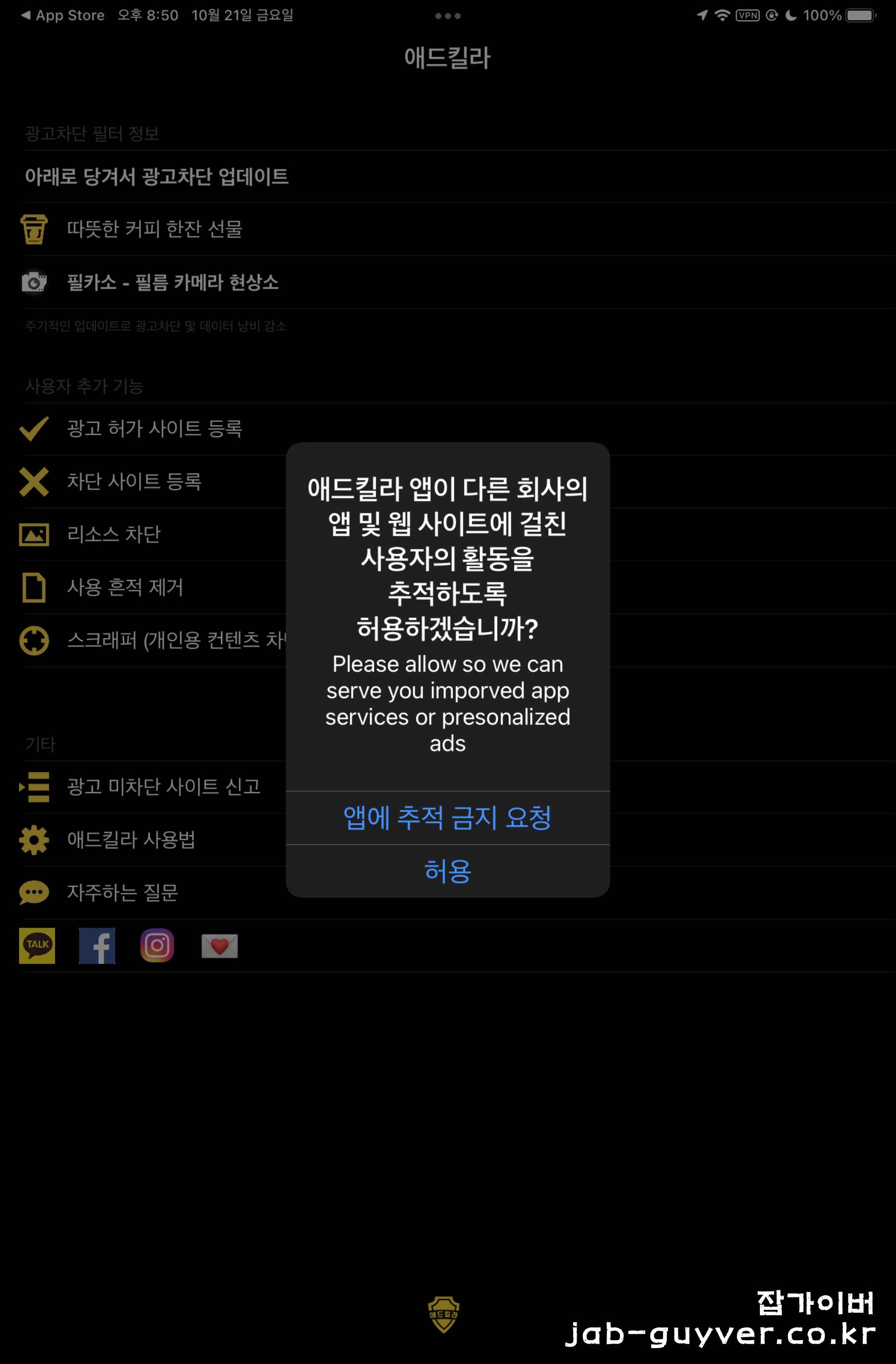 애드킬라 광고차단 앱의설정으로 설치했다면 앱 추적금지 요청합니다.