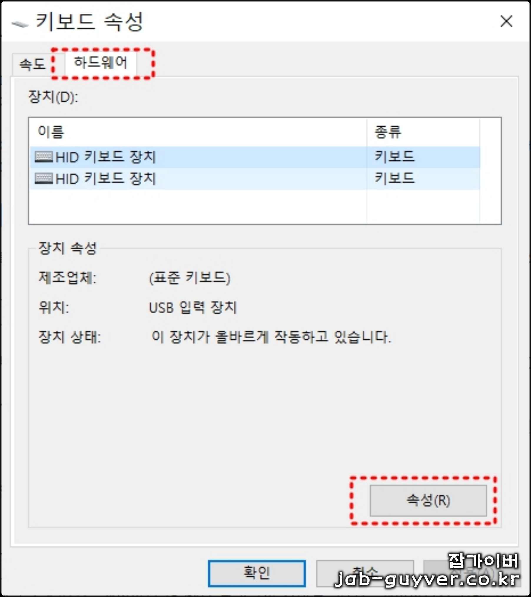 키보드 속성에서 하드웨어 탭으로 이동 후 키보드가 정상적으로 작동하는지 확인하고 장치가 여러개가 중복되어 있다면 모두 제거하고 다시 재설정합니다.