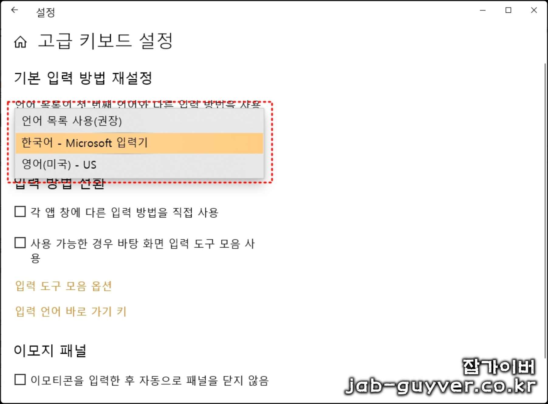 이후에도 시스템 언어가 제대로 작동하지 않거나 한글 영어 키보드 입력에 문제가 있다면 키보드 설정을 다시 재설정합니다.