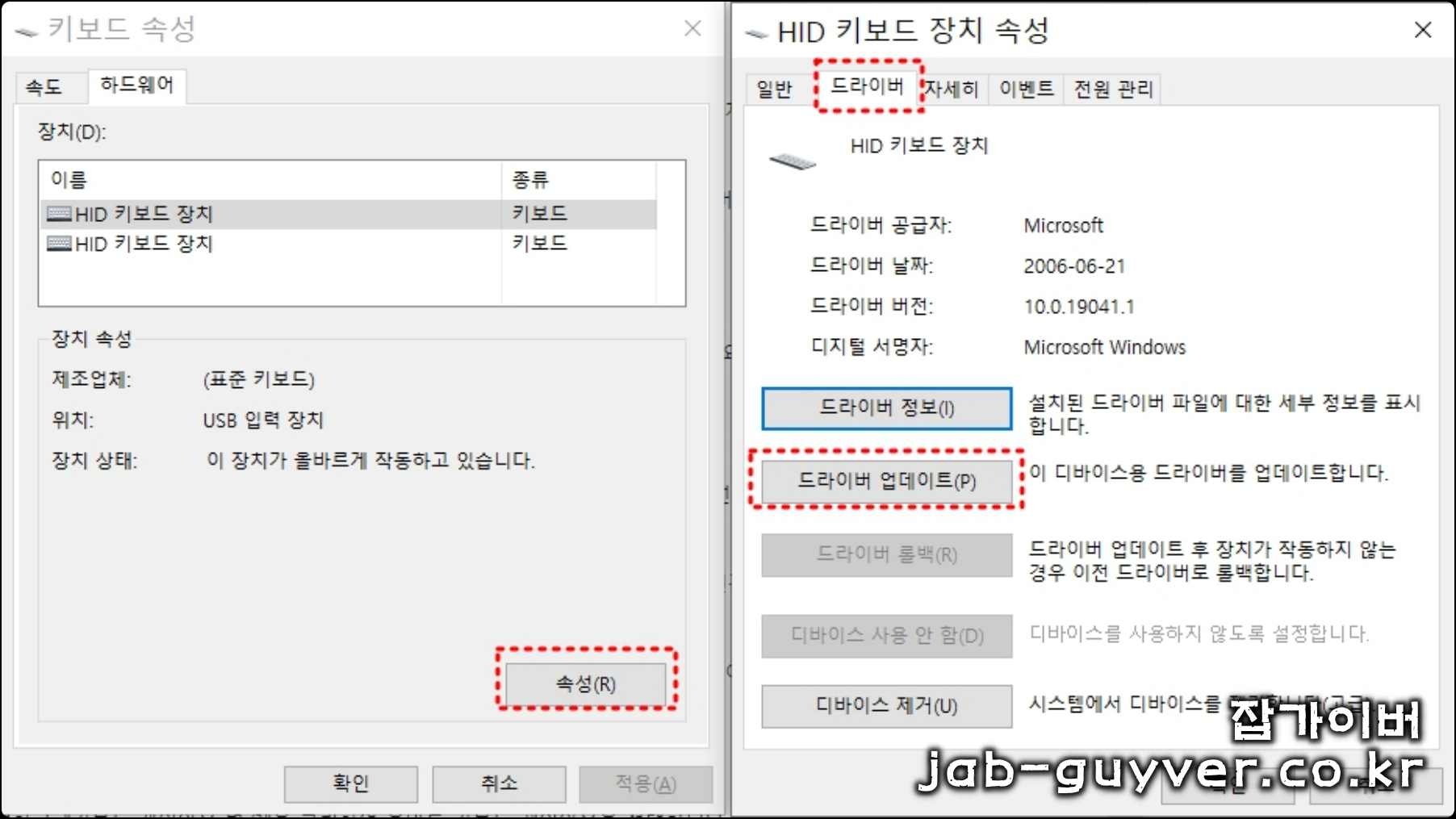 추가로 속성으로 들어가 해당드라이브를 업데이트해서 최신버전으로 키보드 펌웨어를 업데이트합니다.