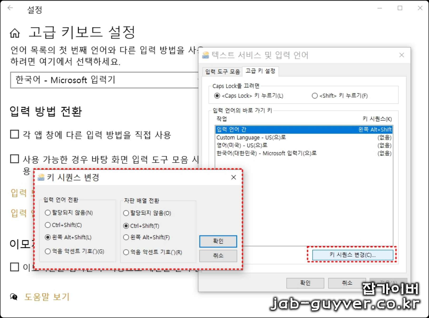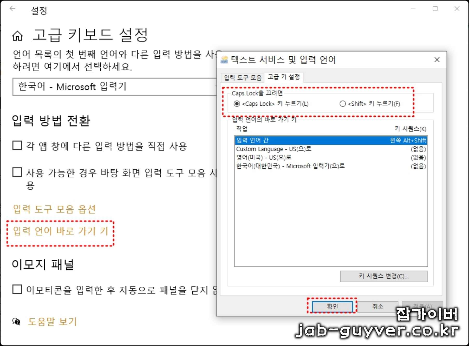 입력 언어 바로가기 키를 통해 고급 키 설정에서 Caps Lock키 누르기 및 Shift 키 누르기 시 입렵언어 및 한글 영어 입력변경을 할 수 있도록 고급 단축키 설정이 가능합니다.