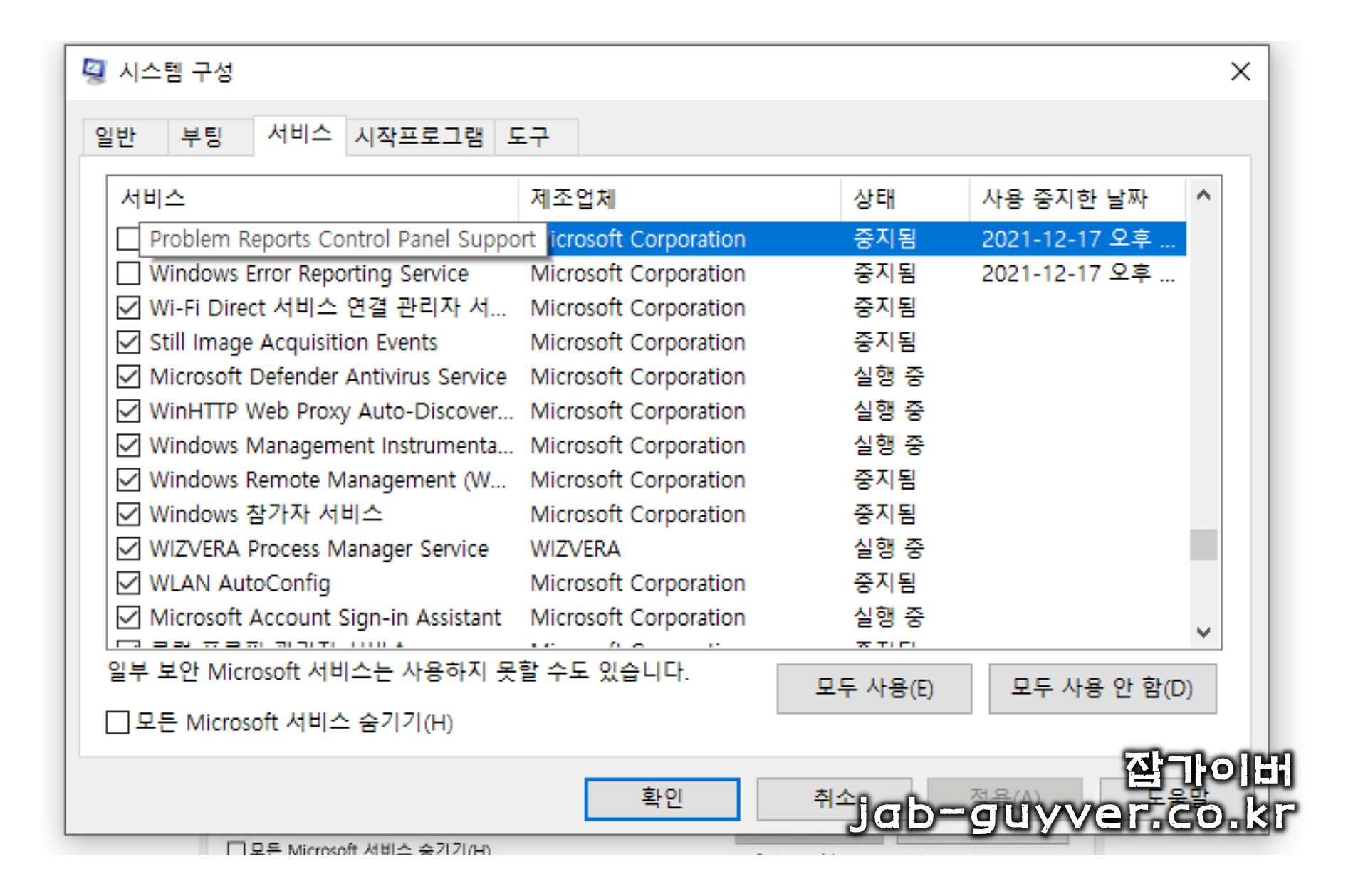 Problem Reports Control Panel 비활성화