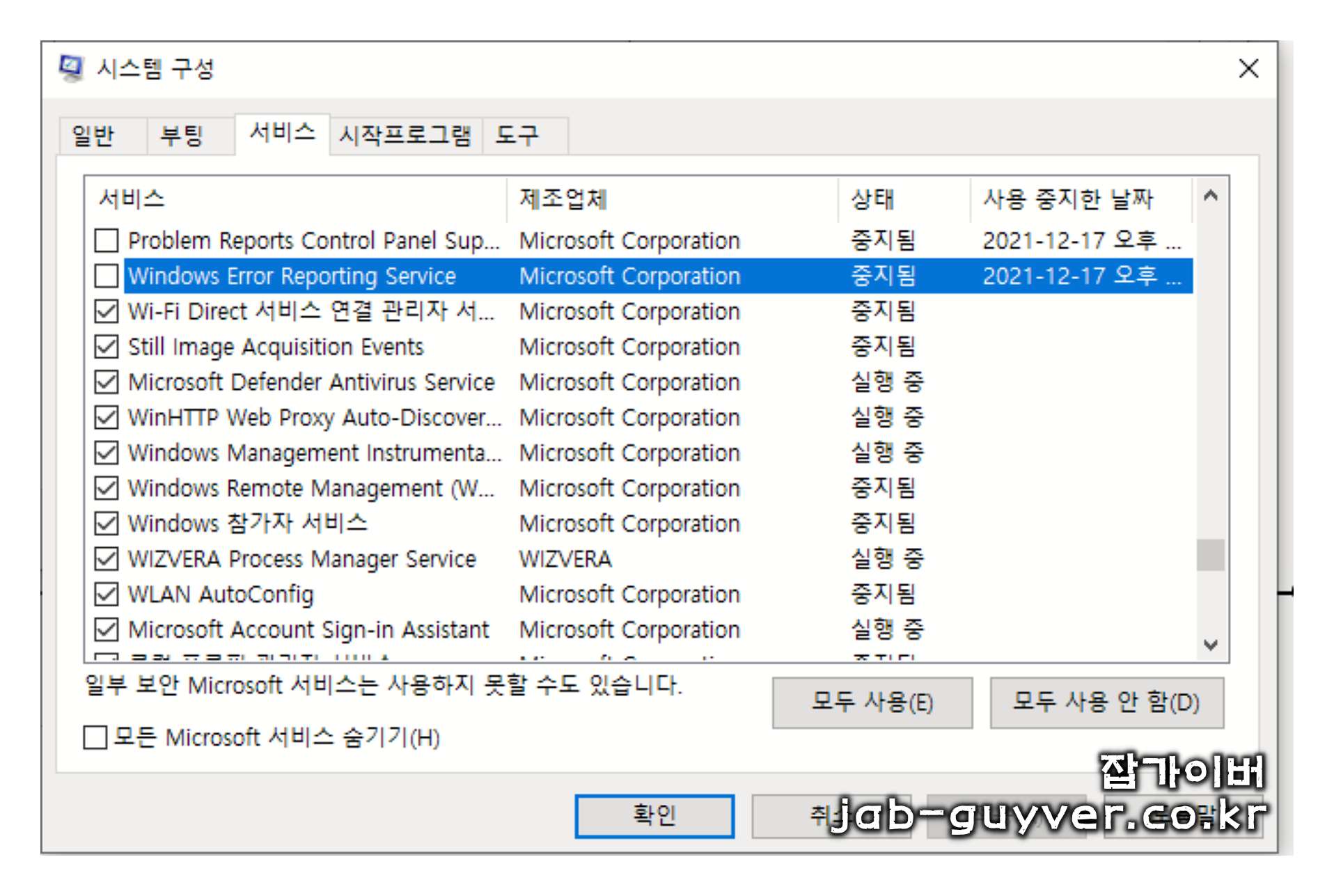 윈도우 검색창에 서비스를 실행 후 해당기능을 비활성화합니다.