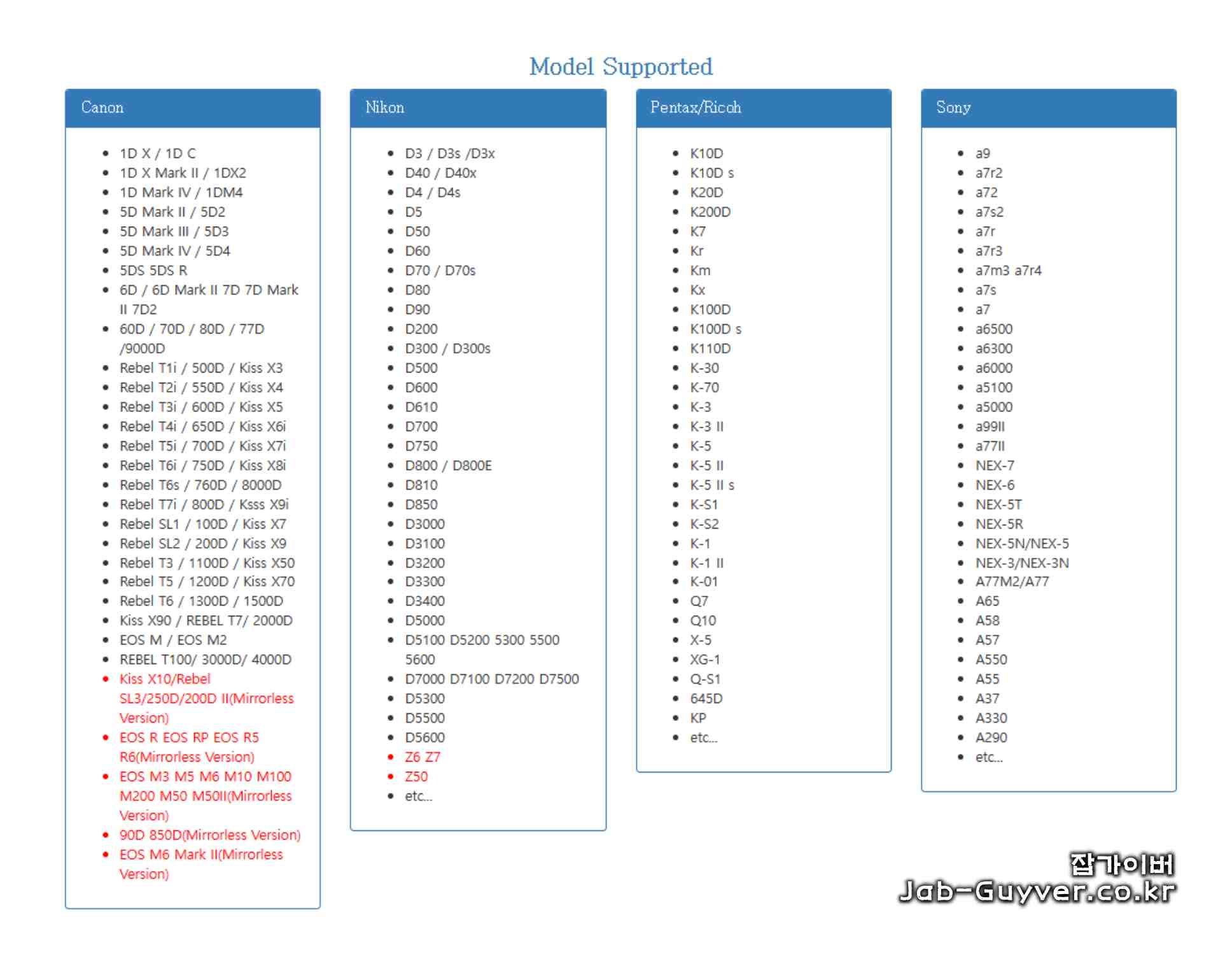 | 캐논 카메라 | 니콘 카메라 | 펜탁스 / 리코 | 소니 카메라 |