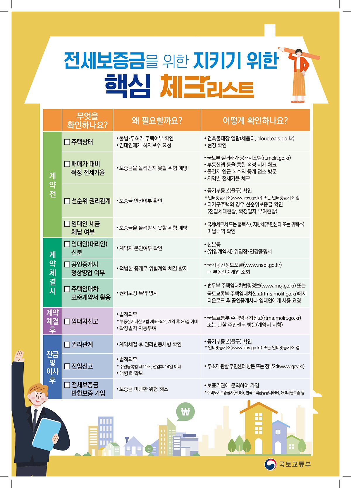 - 전세보증금 반환보증 가입 가능 여부까지 확인해 두면 보증금 안전성 점검에 도움이 됩니다.
