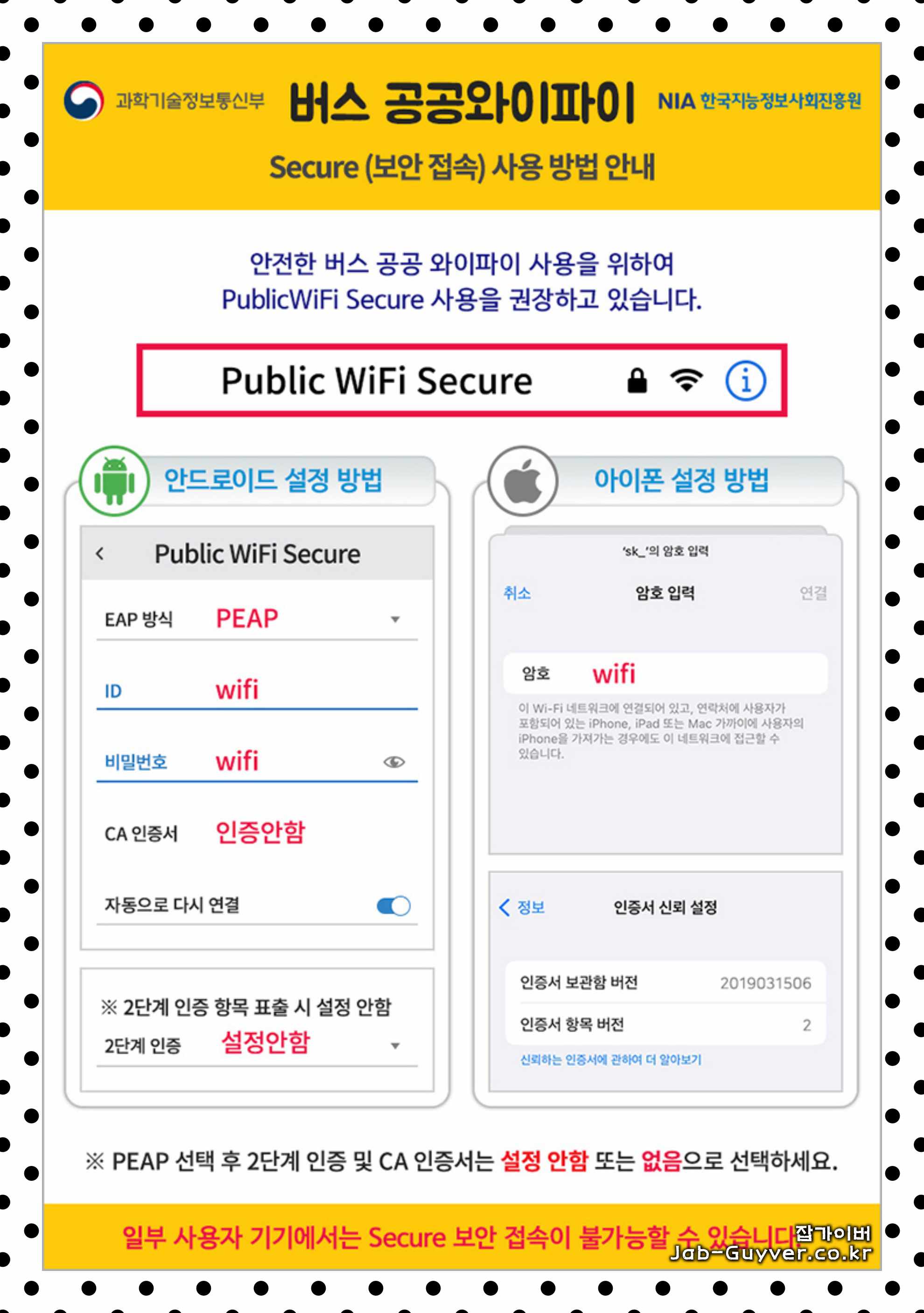 | 통신사 | 와이파이 이름 | 보안 방식 | 암호/접속 방식 설명 |
