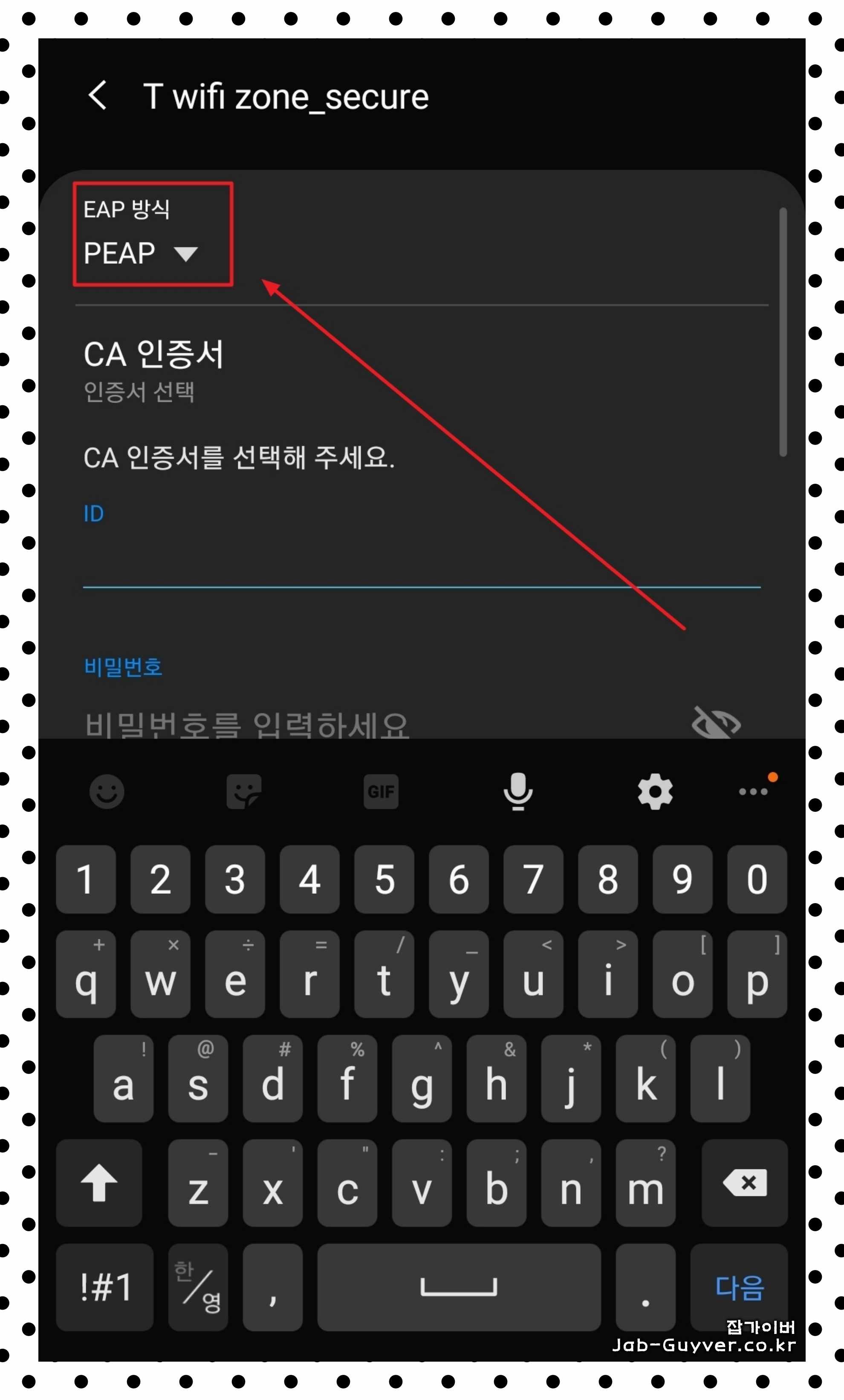 - 이때 EAP 방식을 PEAP 방식으로 되어 있다면 변경합니다.