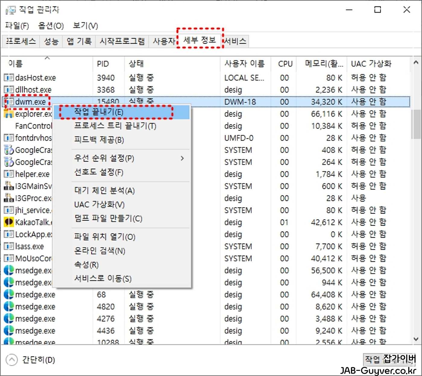 작업관리자 (단축키 Win + ESC) 를 실행 후 세부관리탭으로 이동합니다.