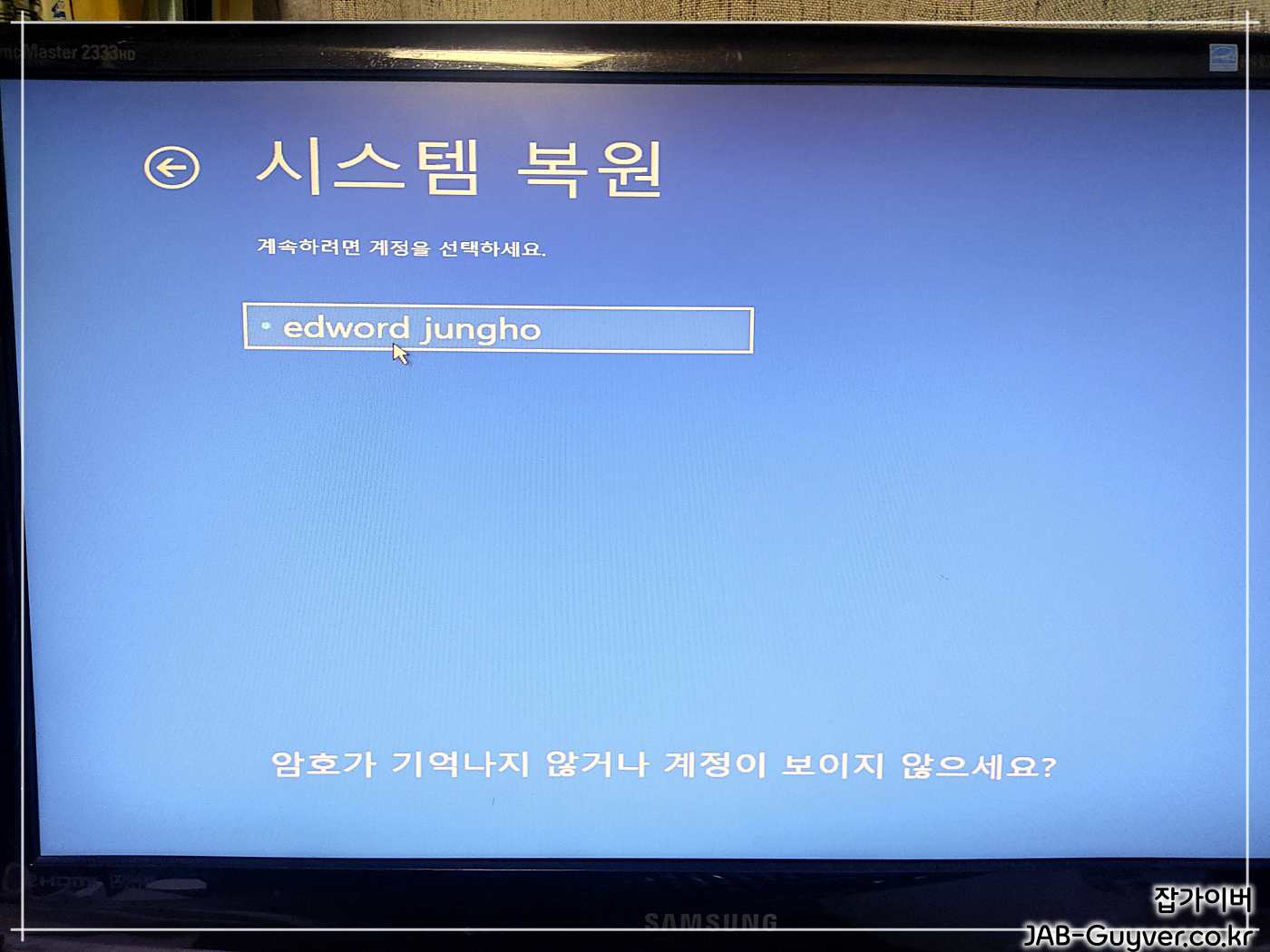 컴퓨터가 다시 시작되면 문제 해결 > 고급 옵션 > 시스템 복원 을 순서대로 선택합니다.