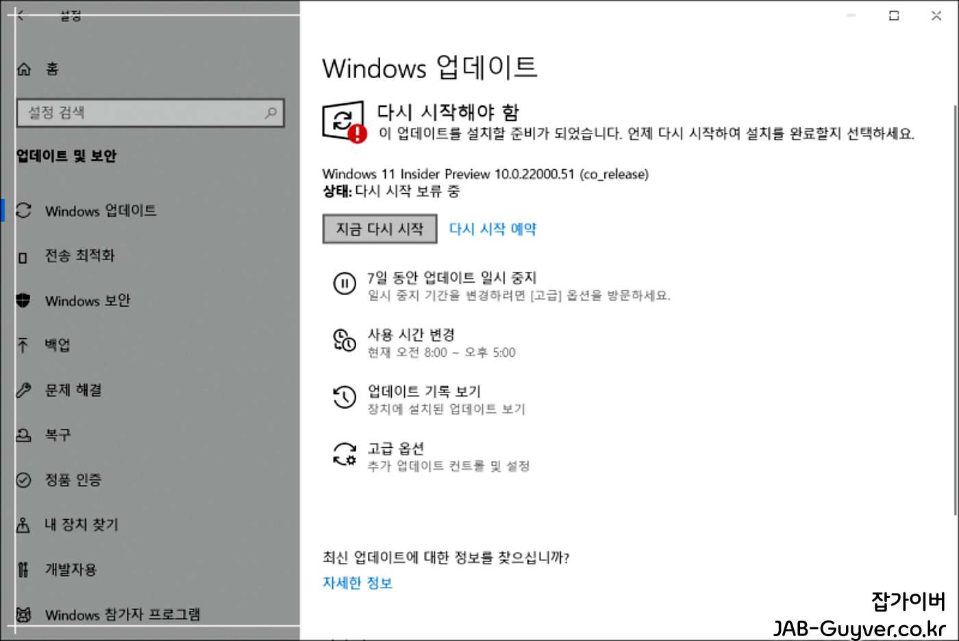 - 설정 > 업데이트 및 보안 > Windows 업데이트 로 이동합니다.