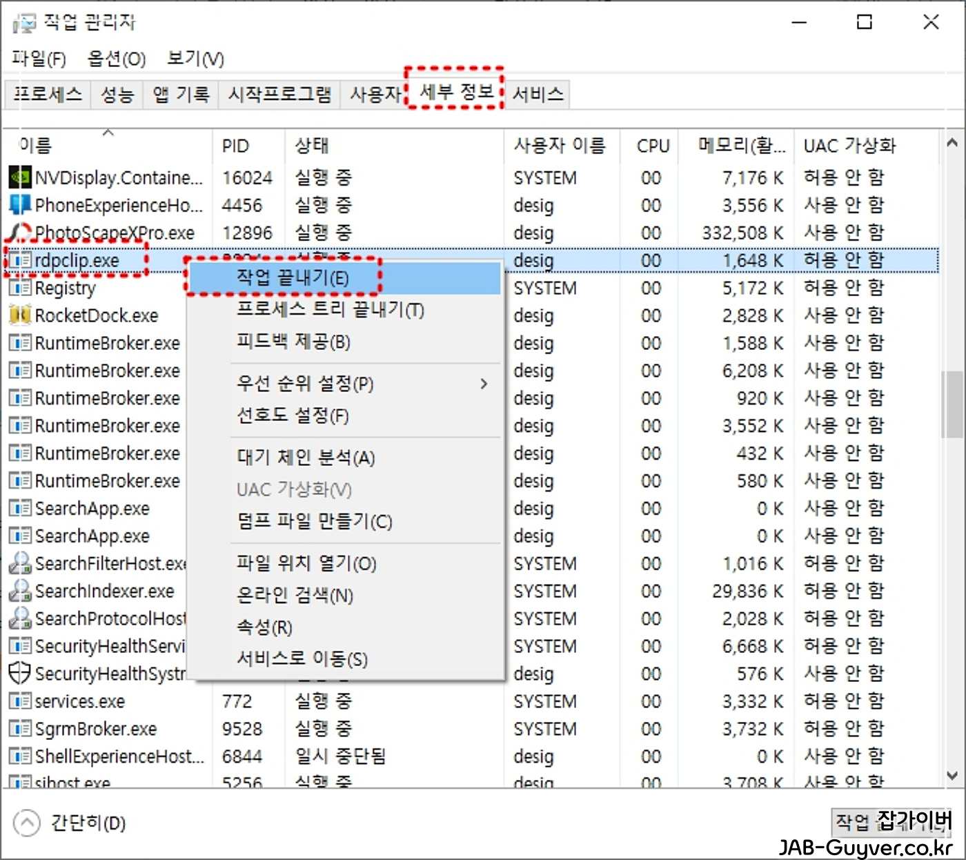 작업관리자 (단축키 Win + ESC) 를 실행 후 세부관리탭으로 이동합니다.