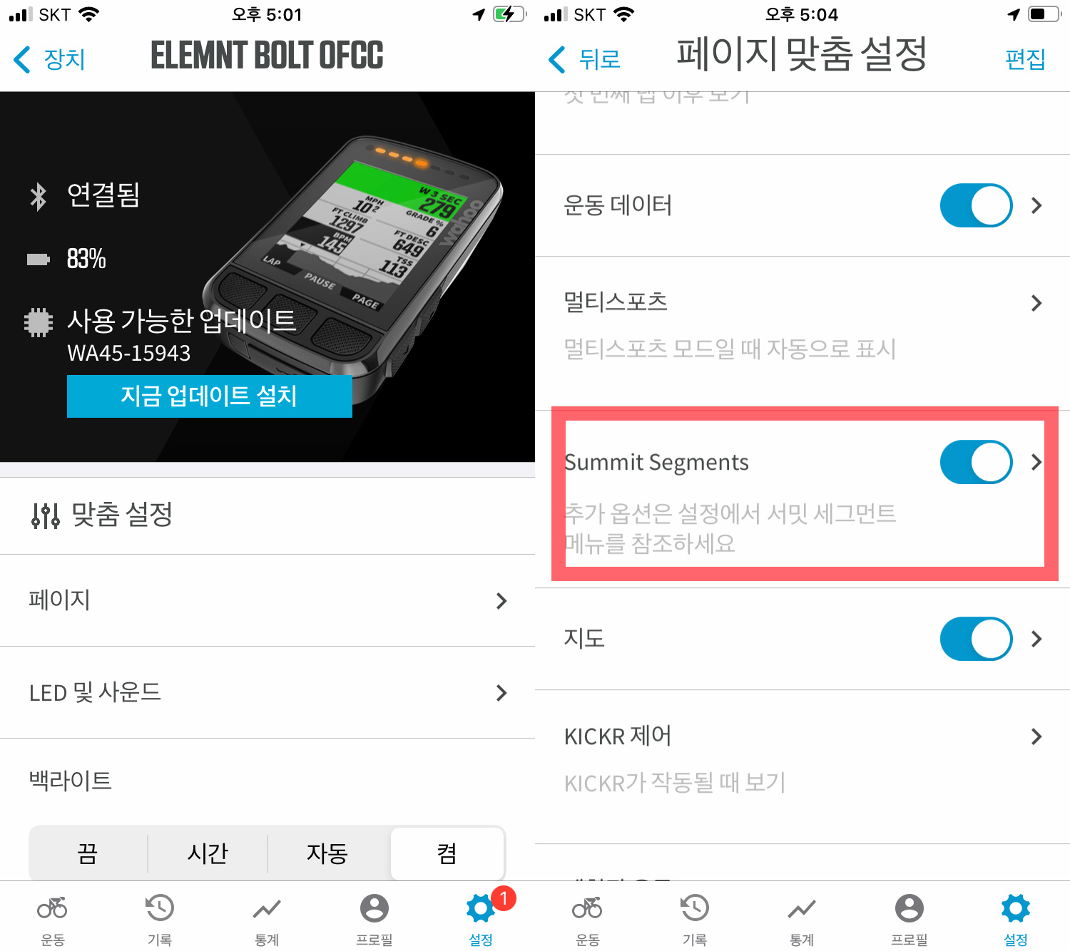 와후 설정 화면에서 Summit Segments를 누르면, 라이딩 도중 자동으로 Summit Segments 페이지로 이동할 지 설정할 수 있으며 라이딩 시 업힐이 예상되면 자동으로 Summit Segments 페이지로 이동하여 고도표, 예상 시간, 남은 상승 고도 등이 표시됩니다.