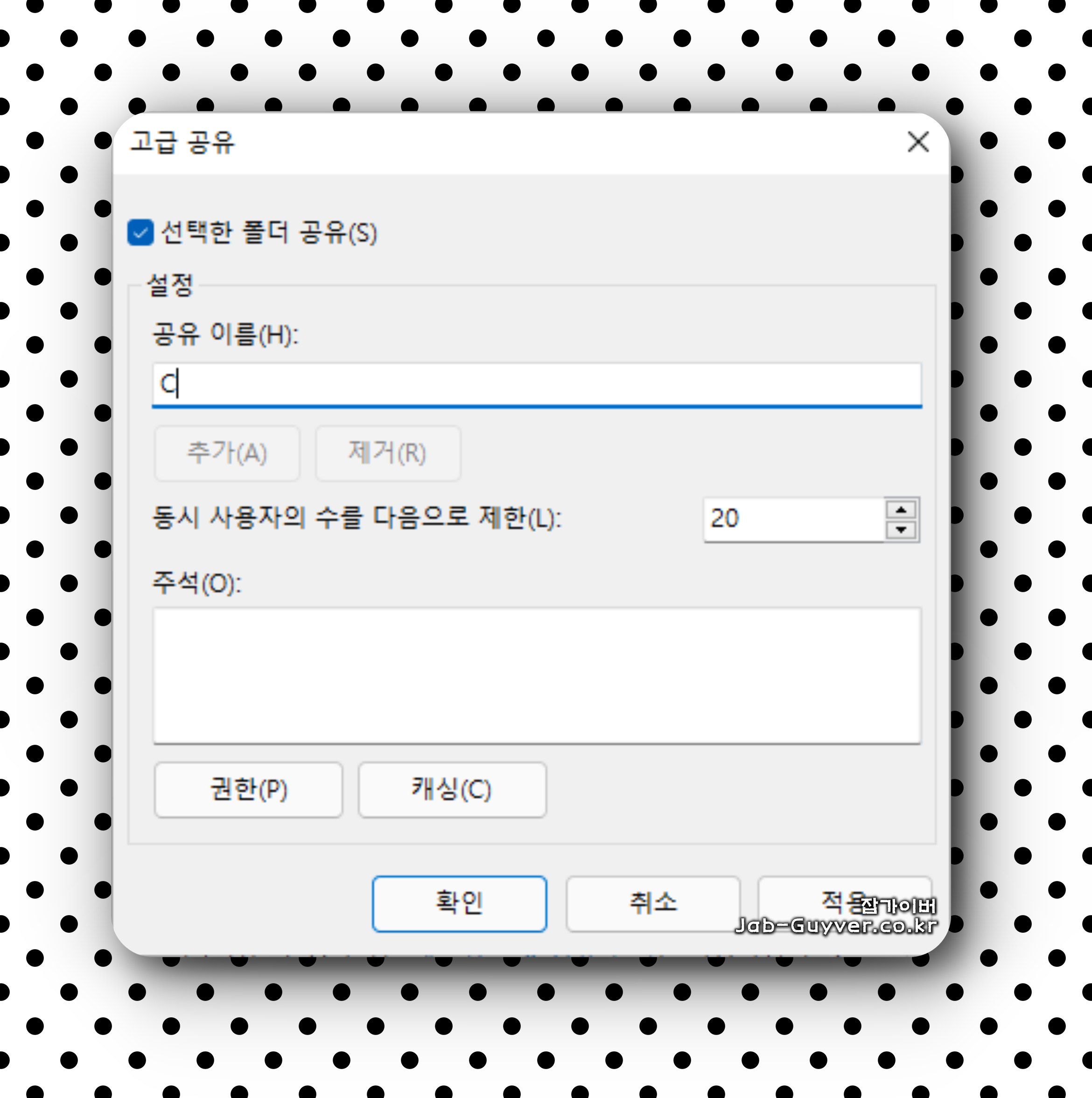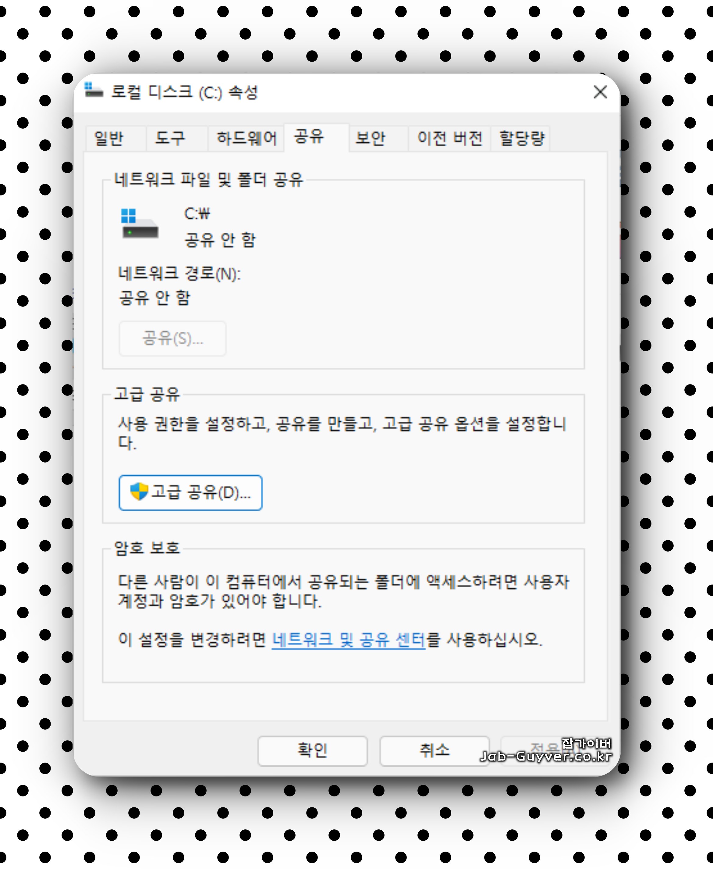 속성 창에서 공유 탭으로 이동하고 고급 공유를 눌러 선택한 폴더를 공유에 체크합니다.