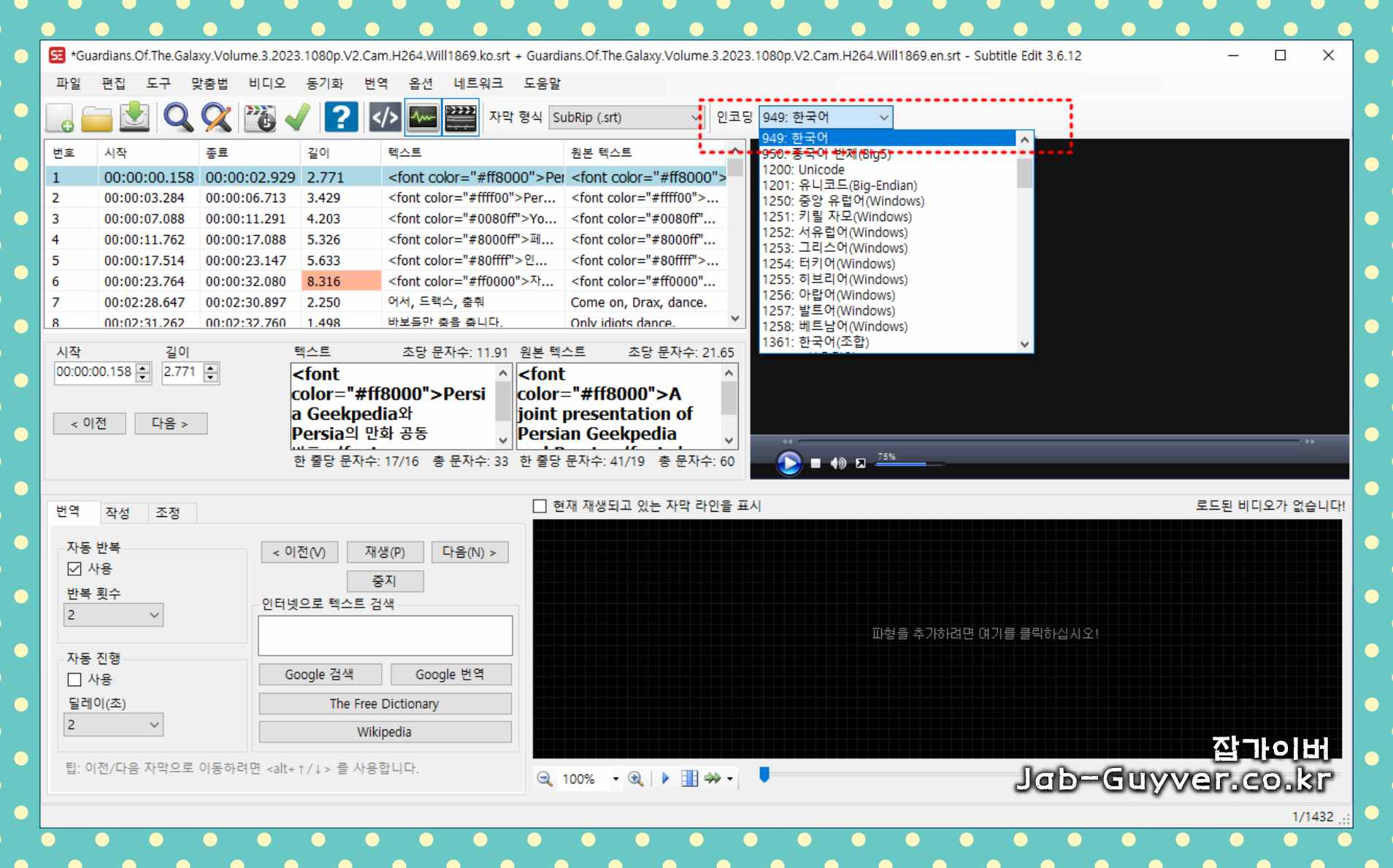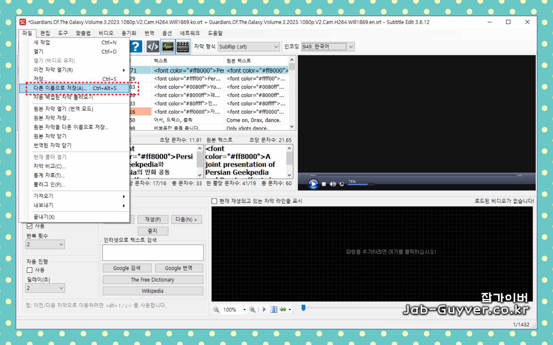 이후 인코딩을 한국어로 설정하고 영어자막을 한국어로 잘 되었는지 확인 후 다른이름으로 저장을 통해 번역된 자막을 저장합니다.