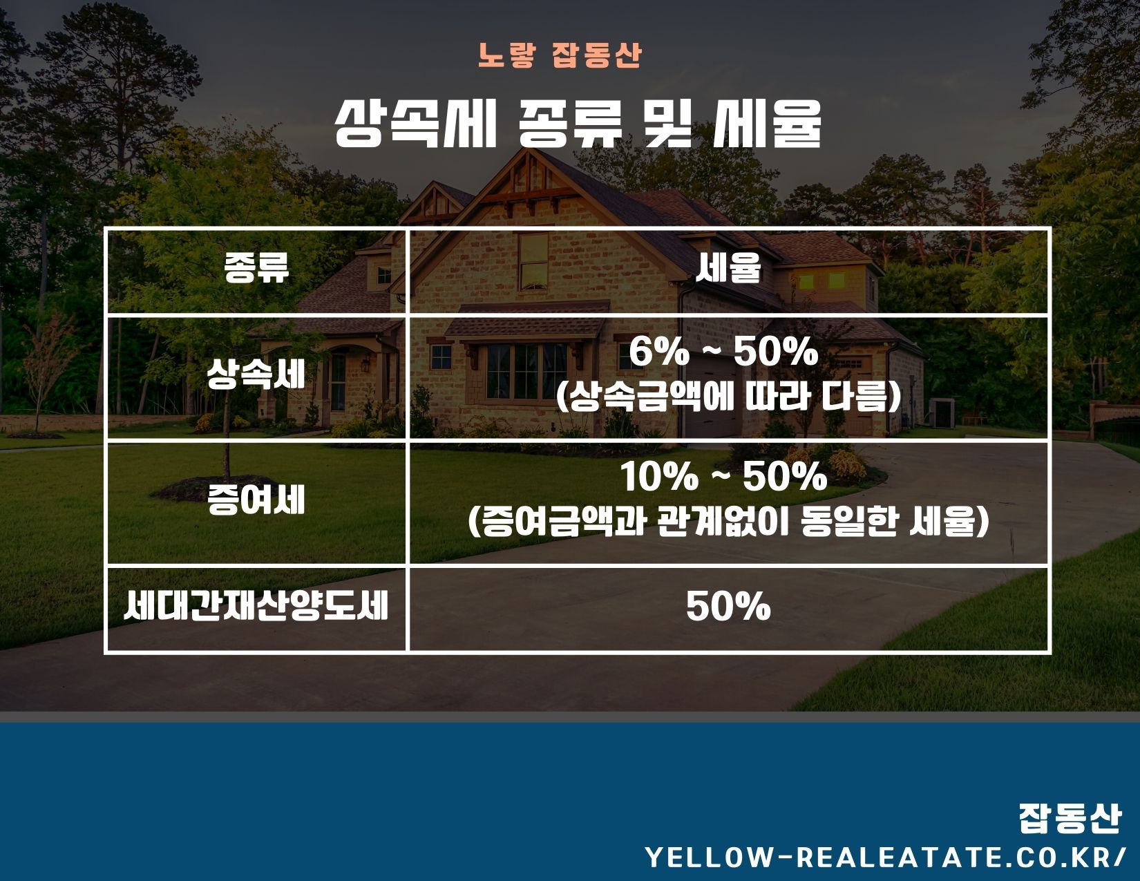 | 상속세 | 6% ~ 50% (상속금액에 따라 다름) |