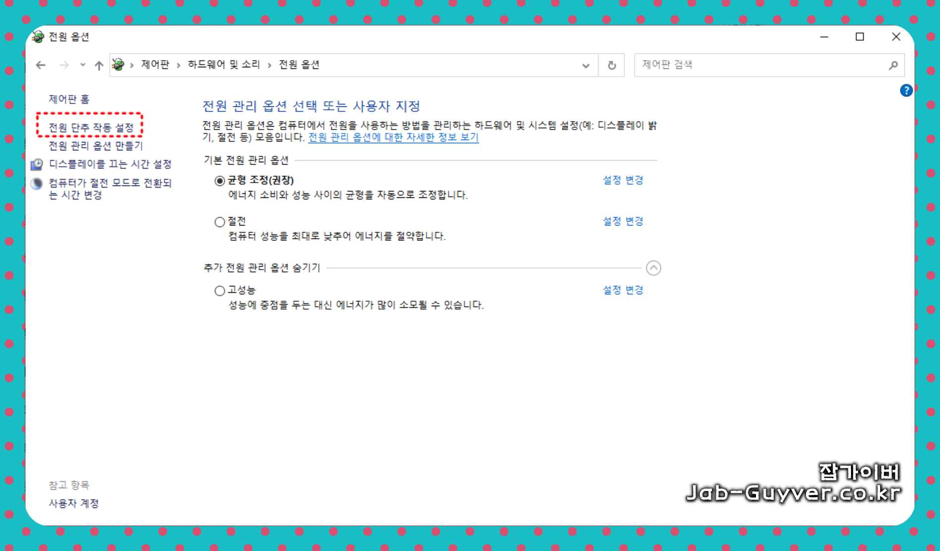 "선택한 전원 계획 편집"을 선택 해 "전원 버튼 작동 설정"을 선택합니다.