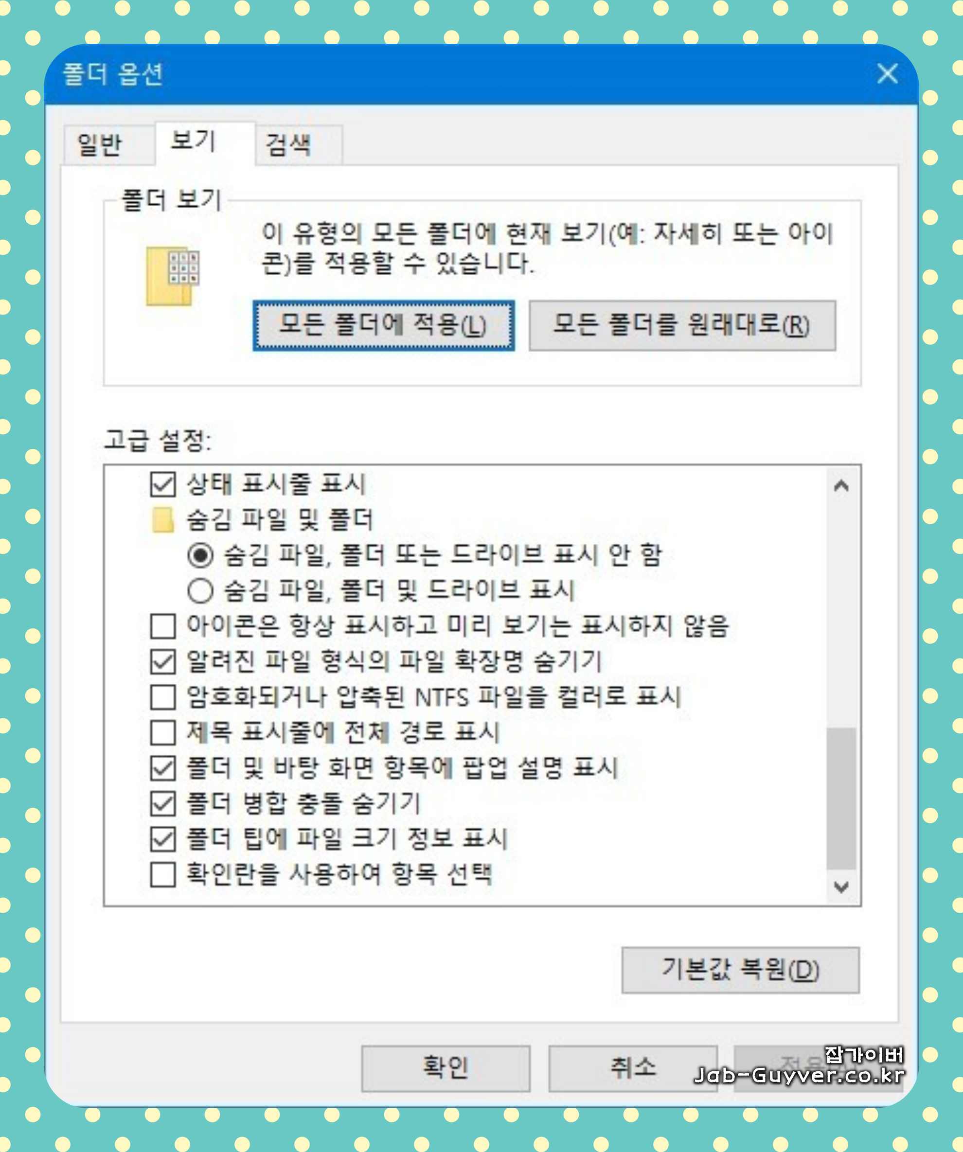 다음 폴더옵션으로 들어가 아이콘은 항상 표시하고 미리보기는 표시하지 않음을 체크해제했는지 확인합니다.