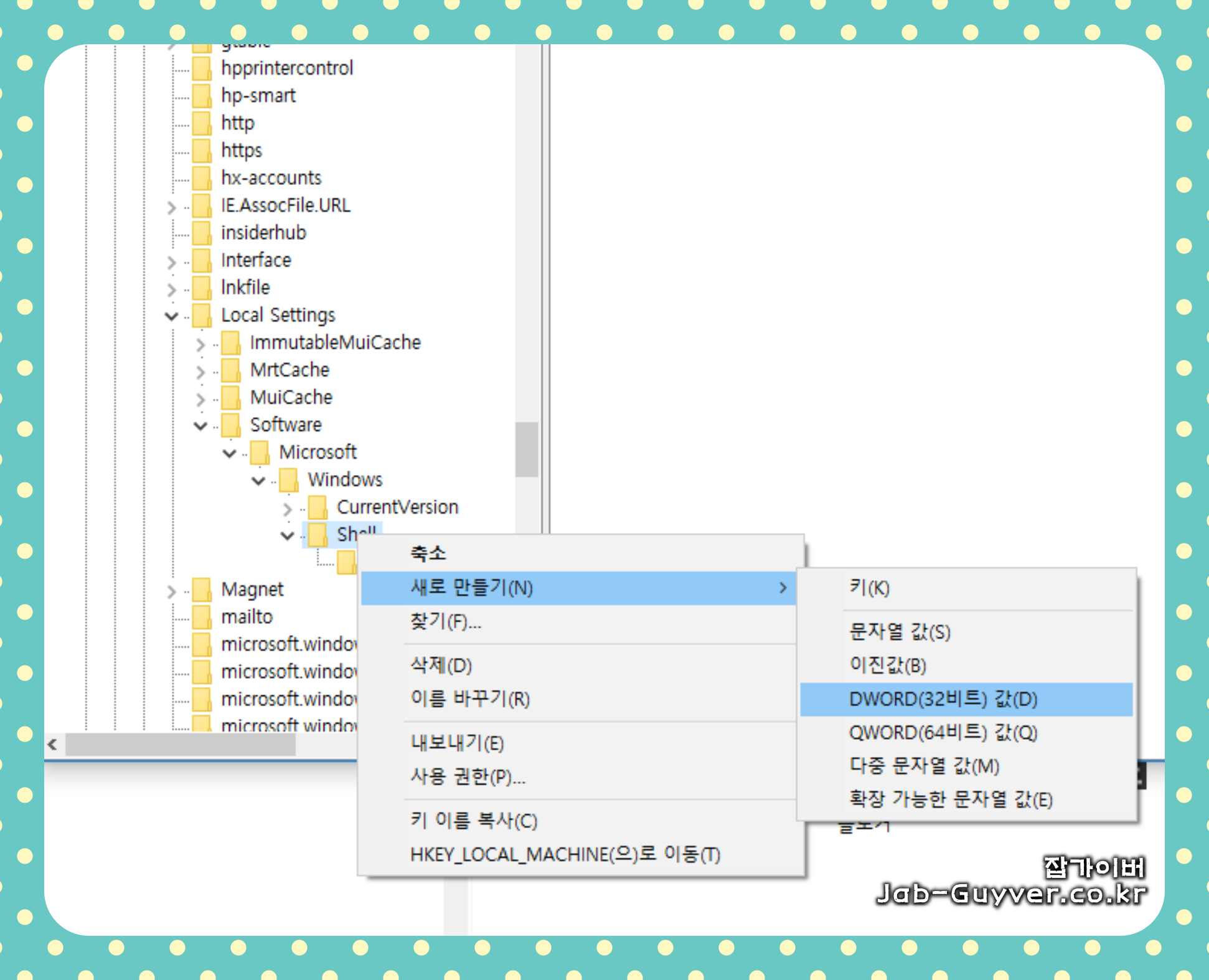 다음 Shell 폴더에 새로 만들기 -> DWORD (32비트)값을 추가합니다.