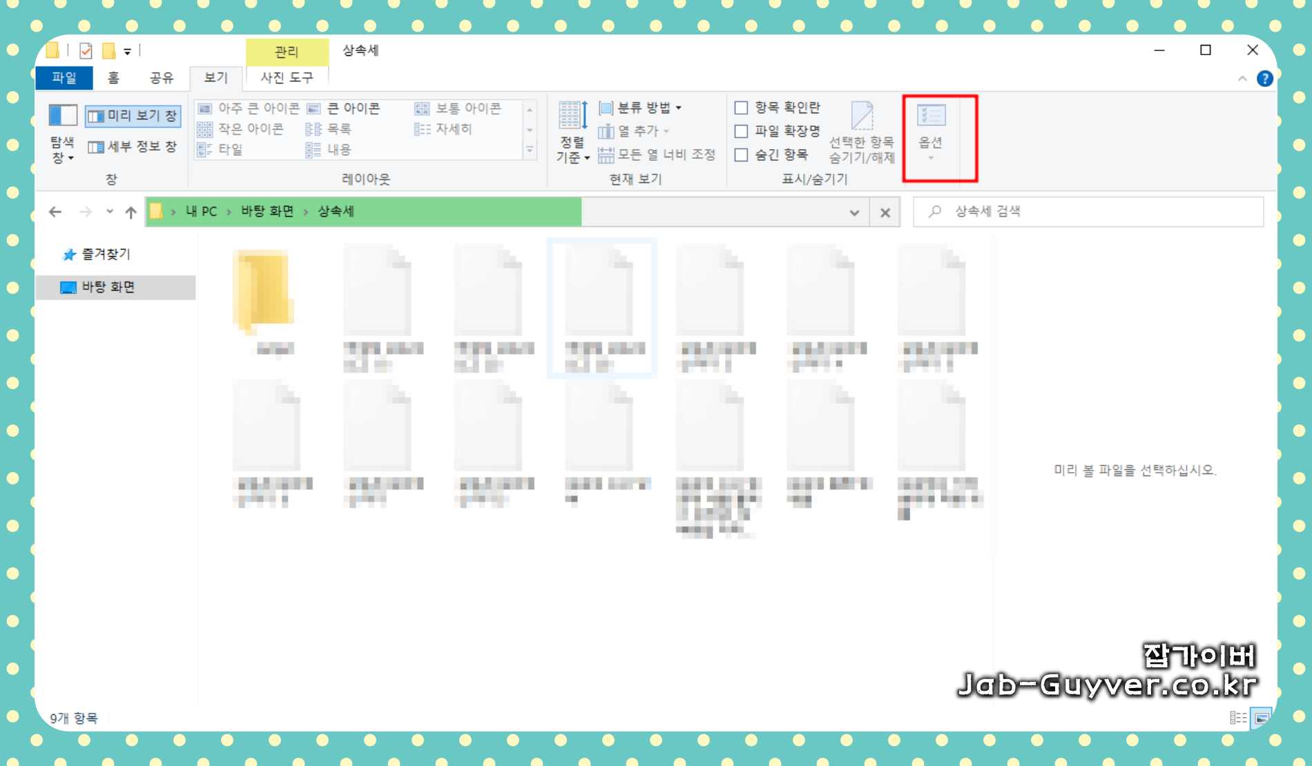우선 보기탭에서 미리보기창과 함께 아이콘 크기를 아주 큰 아이콘으로 설정되어 있는지 확인합니다.