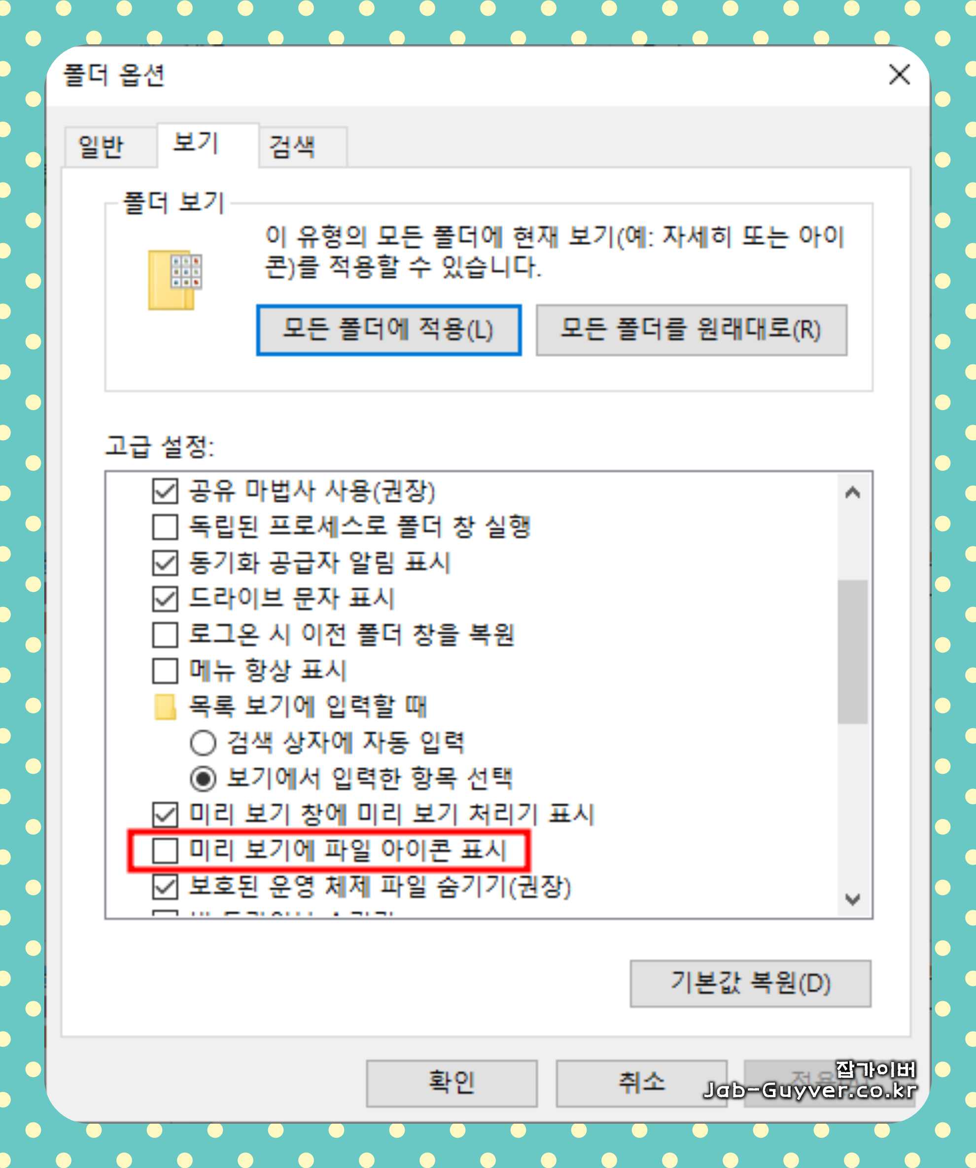 미리보기에 파일아이콘 표시와 아이콘은 항상 표시하고 미리보기는 표시하지 않음 모두 체크를 해제합니다.