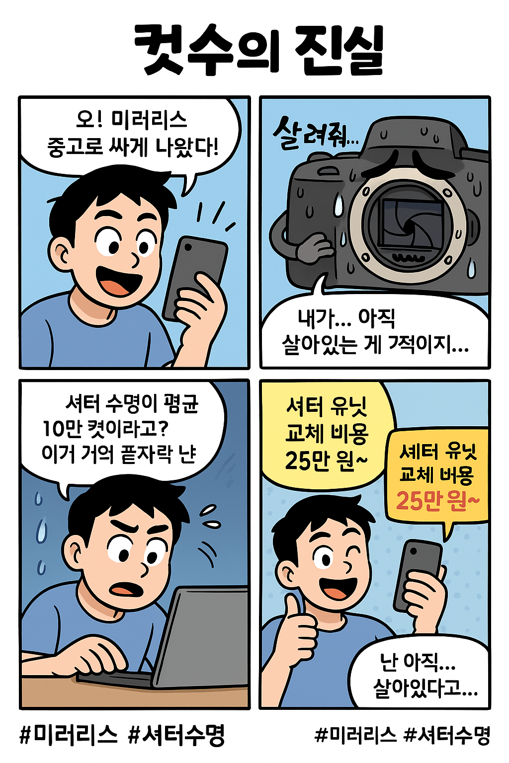 물론 이보다 더 오래 사용할 수도 있고, 이보다 더 빨리 고장날 수도 있습니다. 셔터 외에도 미러박스, 렌즈의 줌 링크나 초점 링크 등도 마모되거나 손상될 수 있으므로 정기적으로 점검이 필요합니다.