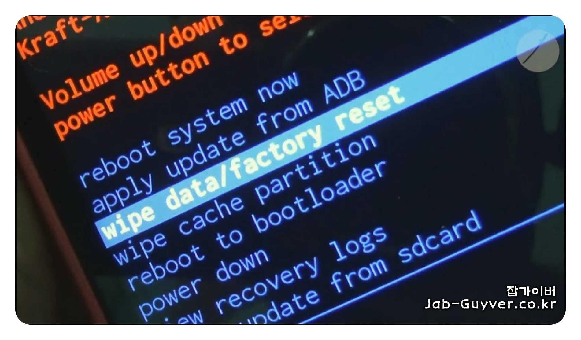 - 복구 모드에 들어가서 "wipe data/factory reset" 옵션을 선택 후 전원버튼을 눌러 줍니다.