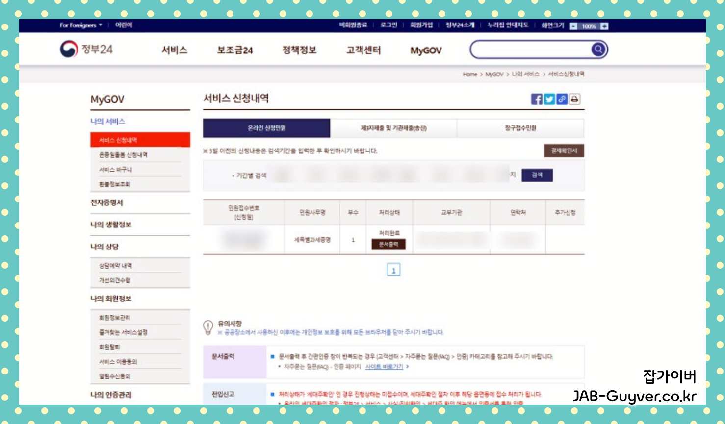 서비스 신청내역을 확인 후 처리상태가 완료인 것을 확인 할 수가 있으며 이후 문서출력을 눌러 줍니다.