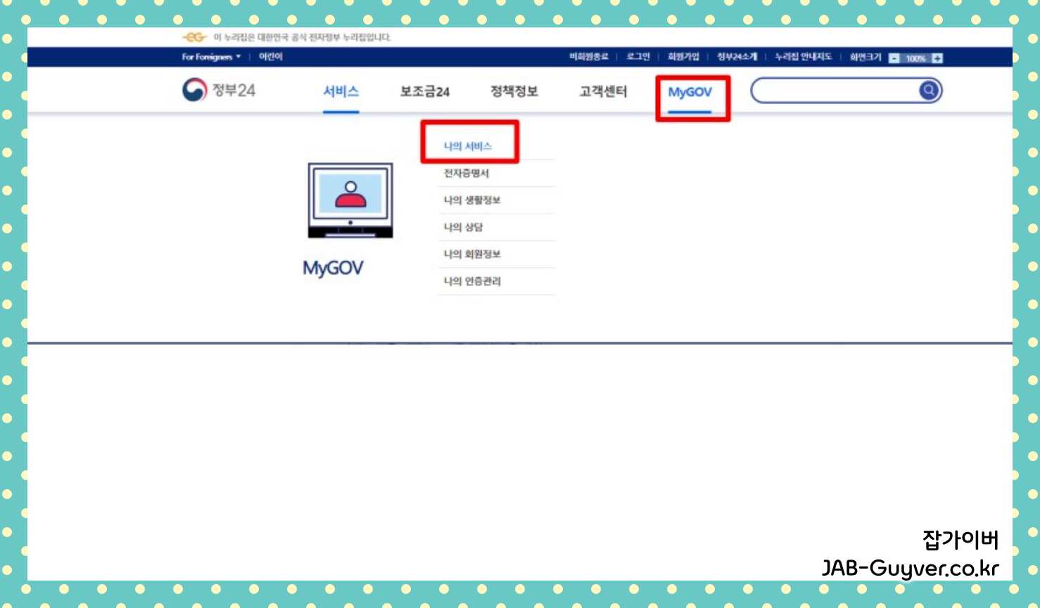 인증절차로 간편인증 및 금융인증서로 인증을 완료 후 상단 메뉴 MyGov -> 나의 서비스 항목으로 들어갑니다.