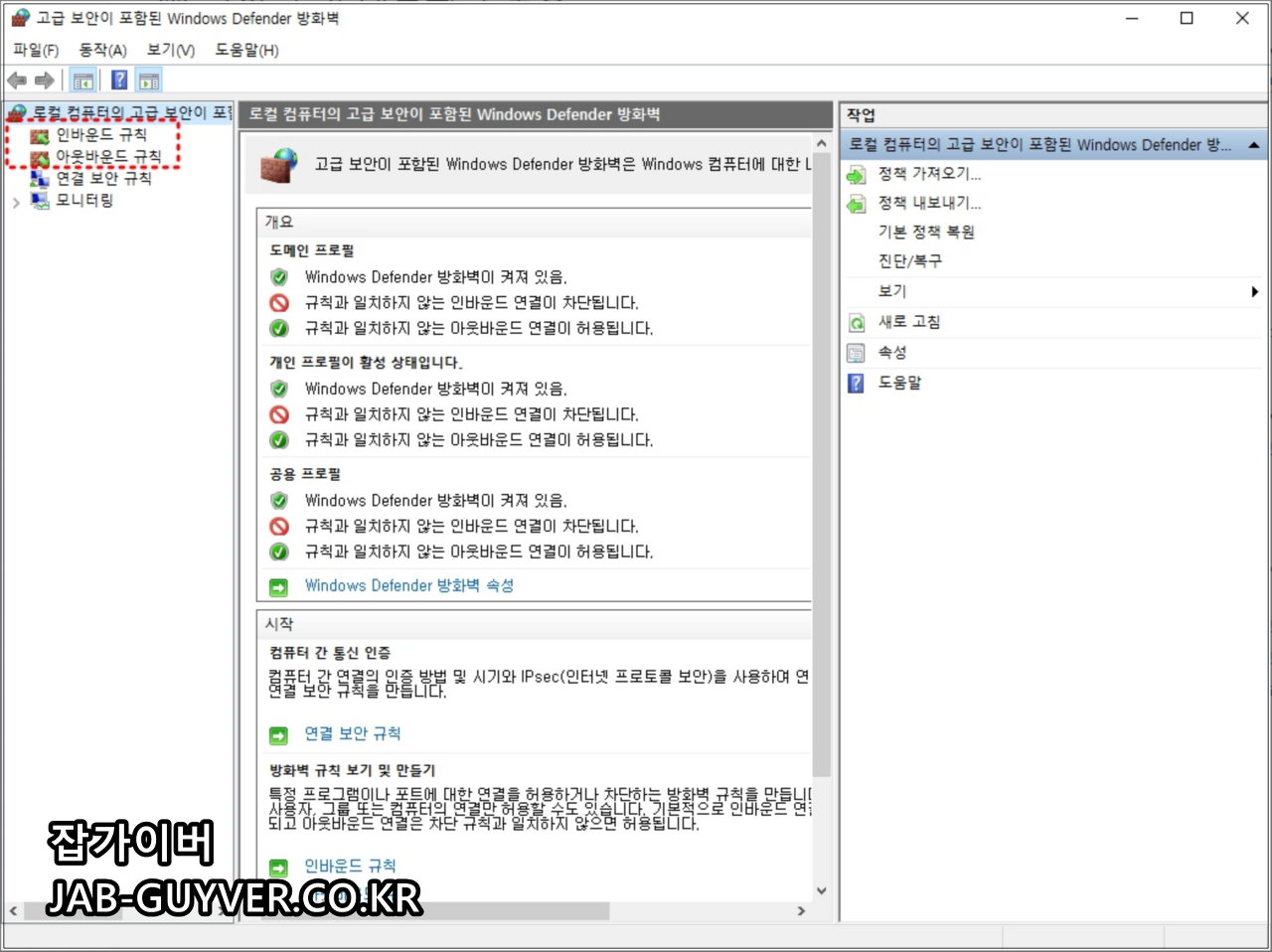 왼쪽 메뉴에서 고급 설정을 클릭하면, 인바운드·아웃바운드 규칙을 세부적으로 관리할 수 있는 화면이 열립니다.