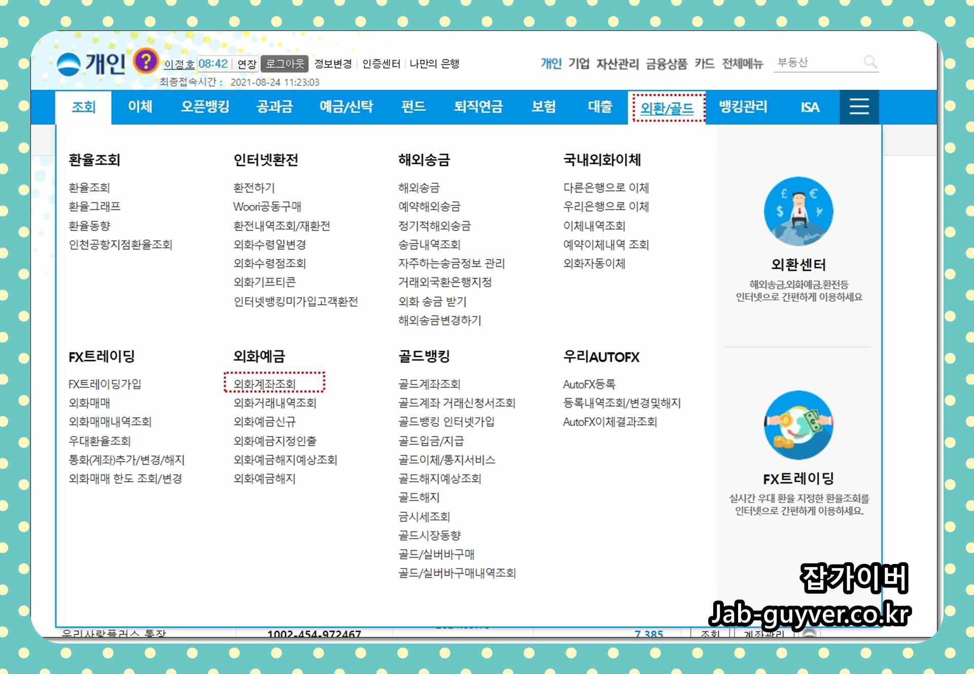 우리은행 달러 환전 이체방법 - 금융인증서 보안카드 구글 애드센스나 외화를 모으는 분들이라면 별도의 우리은행 외화통장으로 받은 달러나 엔화등의 화폐를 한국 화폐단위로 환전하기 위해