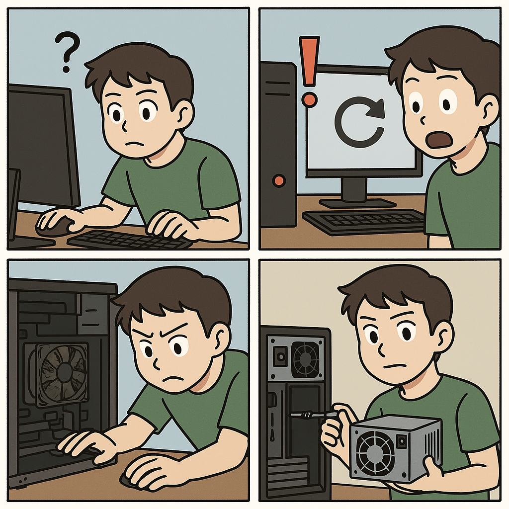 파워서플라이 이상 시 가장 흔한 증상은 전원 인가 직후 바로 꺼짐 혹은 불규칙한 재부팅입니다.