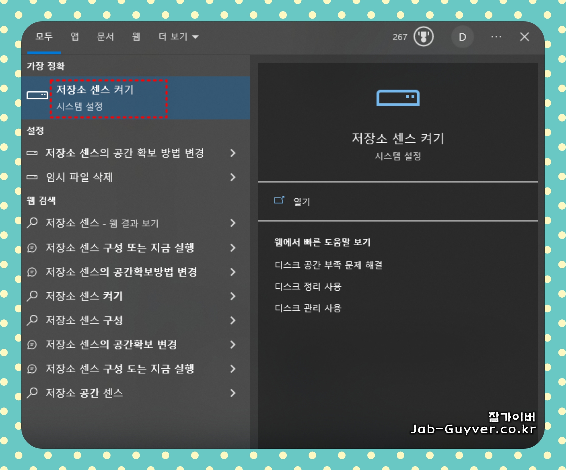 다른방법으로는 윈도우 자측 하단 찾기창에 저장소 센스 켜기를 활성화합니다.